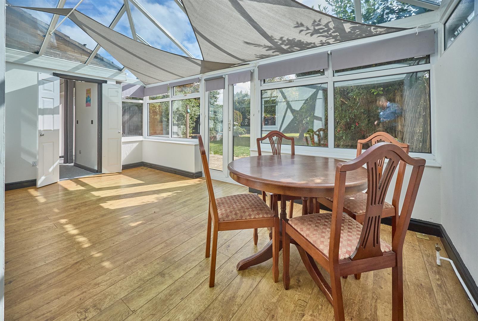 With oak finish laminate wood strip flooring, conservatory blinds are included. Power points, UPVC SUDG French doors leading to the rear garden.