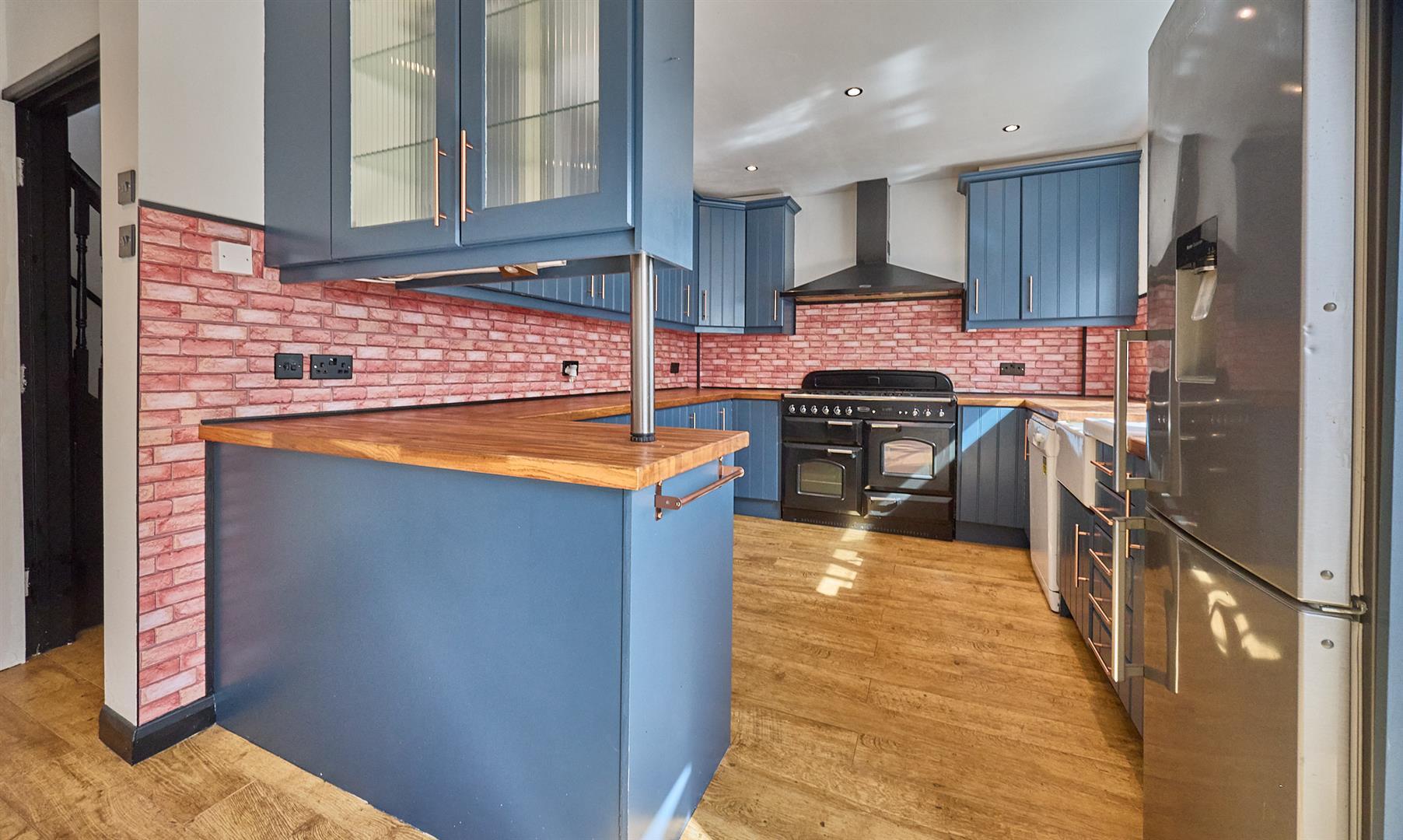With a range of blue fitted kitchen units, consisting inset Belfast single drainer sink unit, mixer taps above, cupboard beneath, further matching range of floor mounted cupboard units and five drawer unit, contrasting solid wood working surfaces above. Further matching range of wall mounted cupboard units including one double display unit with glazed doors. Black Range master range cooker included with a five ring gas hob unit, plate warmer, two ovens and a grill beneath. Matching black chimney extractor hood above, appliance recess points. Dishwasher and fridge freezer included. Oak finish laminate wood strip flooring, inset ceiling spotlights.