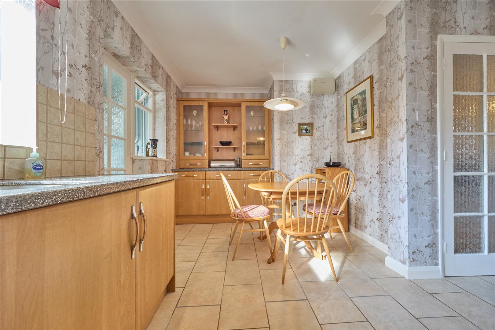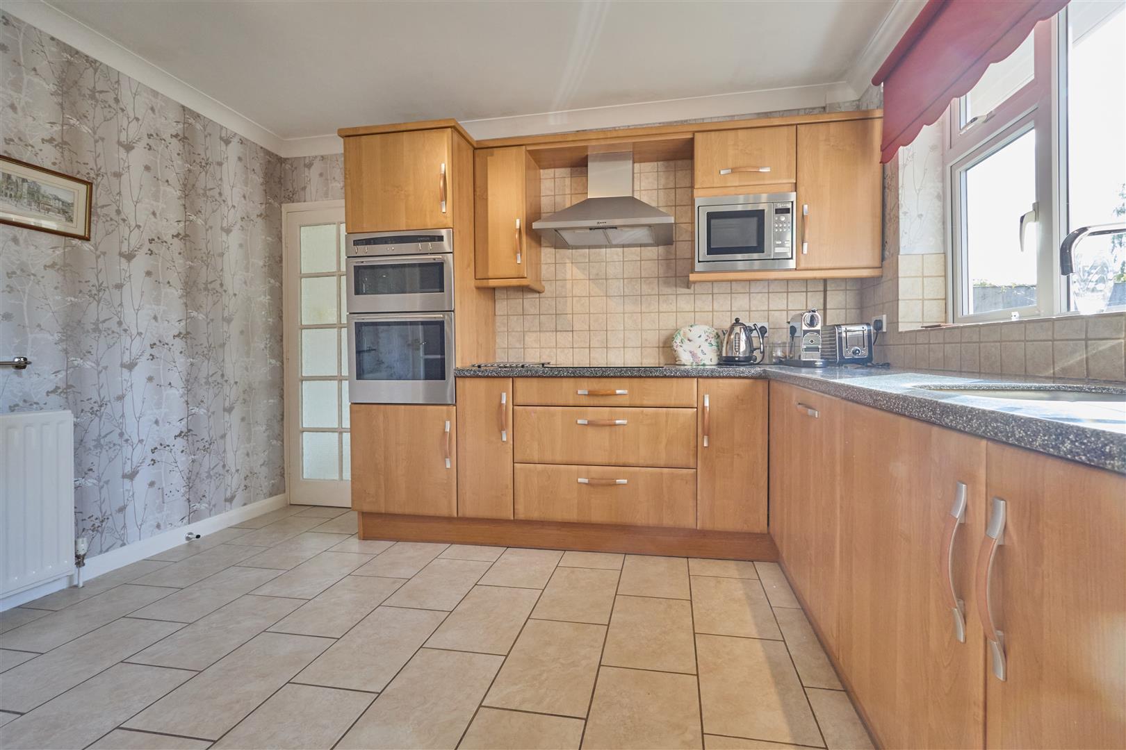 With a range of floor standing kitchen units with roll edge working surfaces above, inset stainless steel sink unit with drainer, inset ceiling spotlights above, mixer taps and cupboard beneath. A Neff four ring electric hob with Neff stainless steel extractor hood above and drawers beneath. Neff double oven and grill, built in Neff microwave, tiled splashbacks. Further range of wall mounted cupboard units including display shelving, double panelled radiator and tiled flooring. Wooden and glazed door to