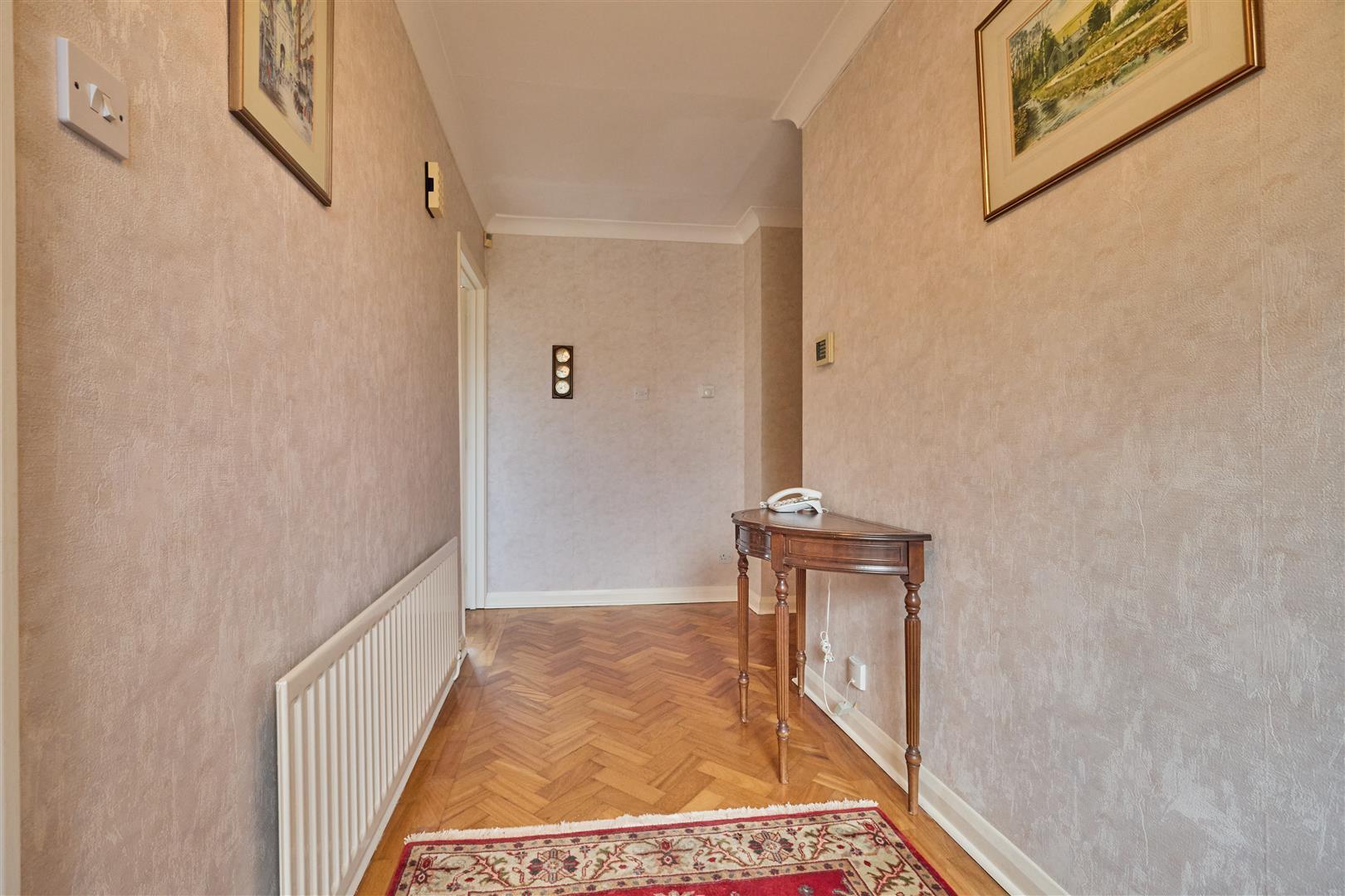 With parquet flooring and single panelled radiator, coving to ceiling and telephone point, ornamental ceiling rose. Several storage cupboards. One of the cupboards in the hallway houses the water tank for the hot water. Wooden and glazed door to