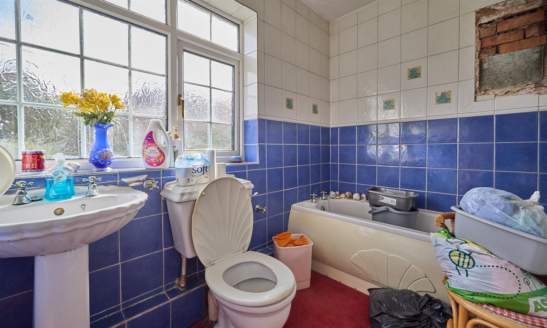 With panelled bath with mixer taps above, low level WC and pedestal wash hand basin. Fully tiled surrounds and double panelled radiator.