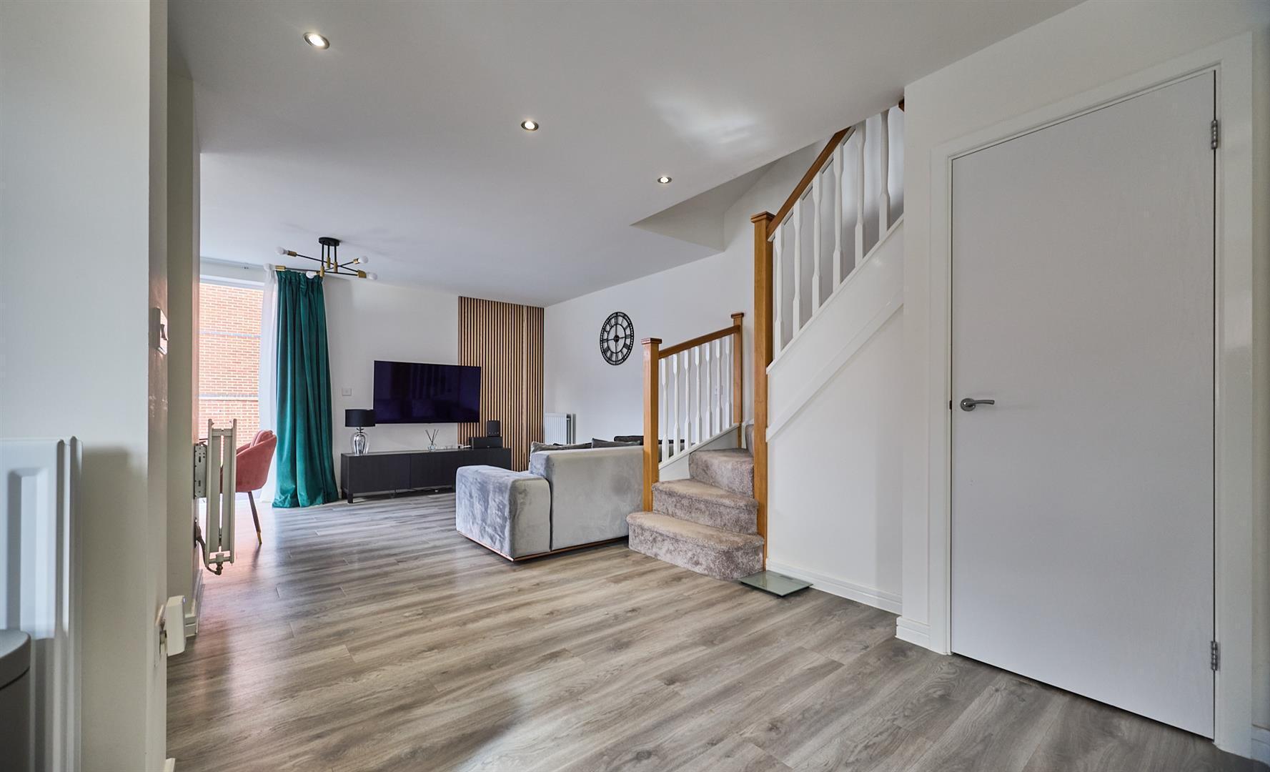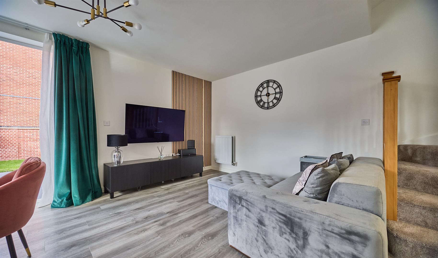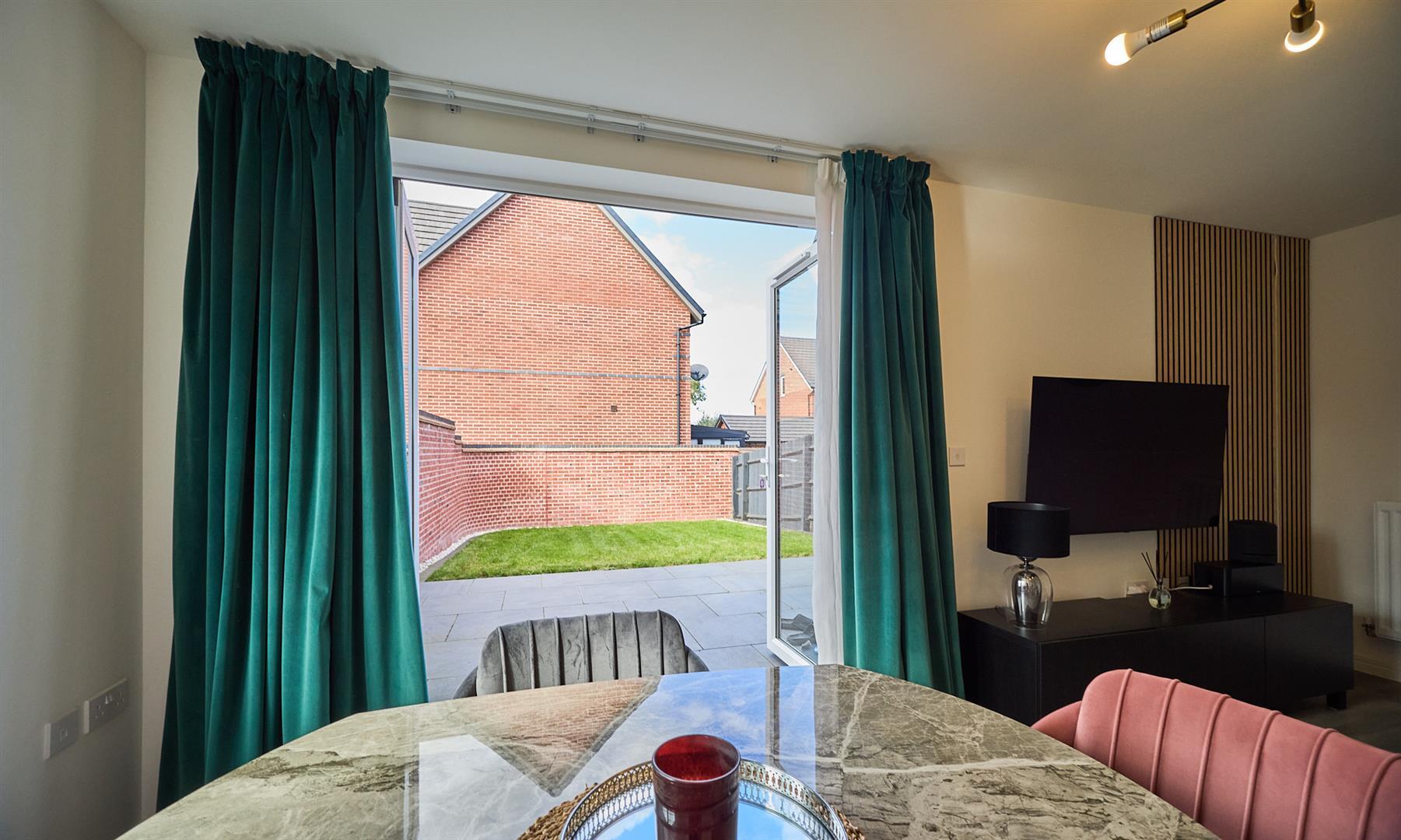 With bi-folding doors to rear garden, fashionable acoustic wall panelling. double panel radiator. Spindle balustrade staircase to the first floor landing.