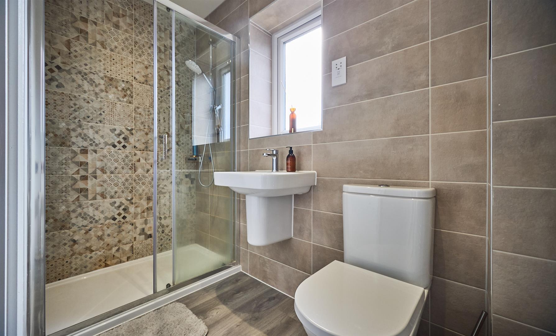 with wall hung wash hand basin with chrome mixer tap, glazed shower enclosure with bar shower & tiled surrounds, inset spotlights, extractor fan.