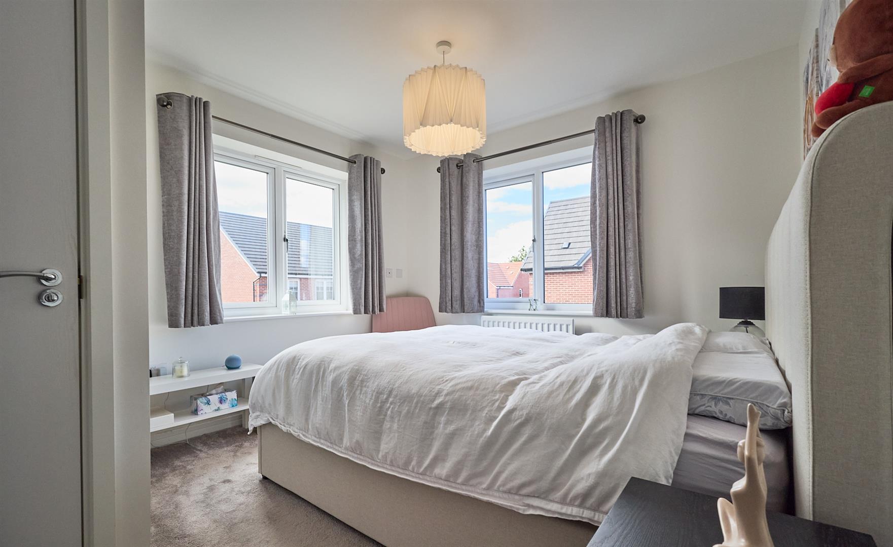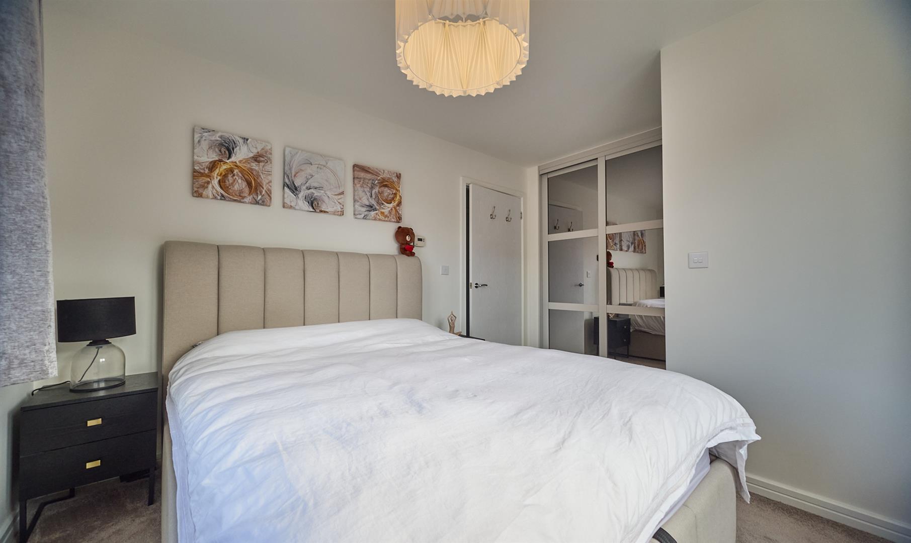 with double panel radiator, mirror fronted built in wardrobes with shelving and hanging rails.