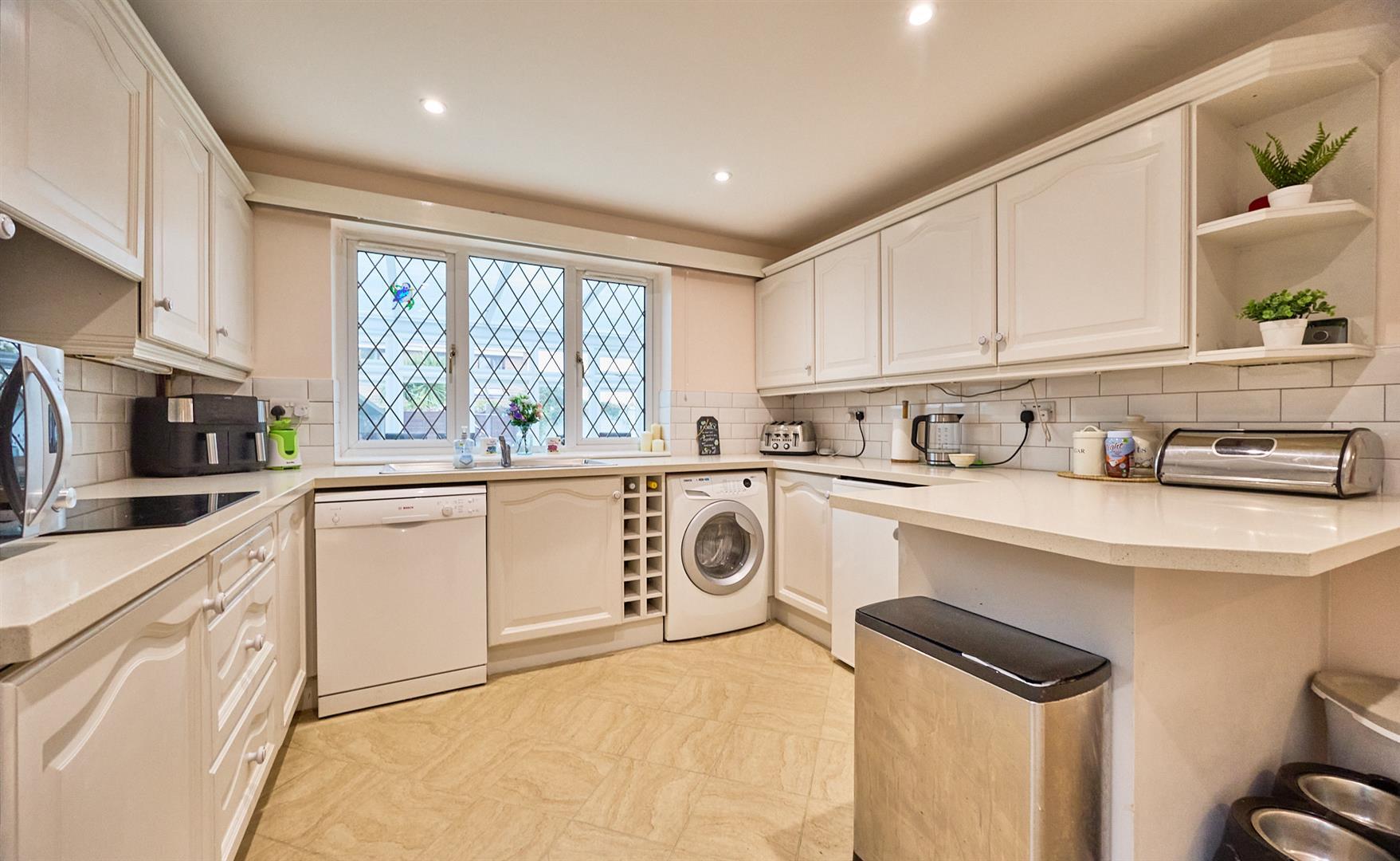 Tile effect vinyl flooring, wall mounted fashionable white radiator, inset spotlights, a range of floor standing white kitchen cupboard units with stone effect working surfaces. One and a half stainless steel drainer including chrome mixer tap, tiled splashbacks, built in double Bosch oven, 4 ring electric Bosch hob, extractor above, single freestanding fridge. UPVC SUDG door for side access. Double doors to a utility cupboard space, electric for tumble dryer, shelving, wall mounted Worcester gas combination boiler for domestic hot water and gas central heating.