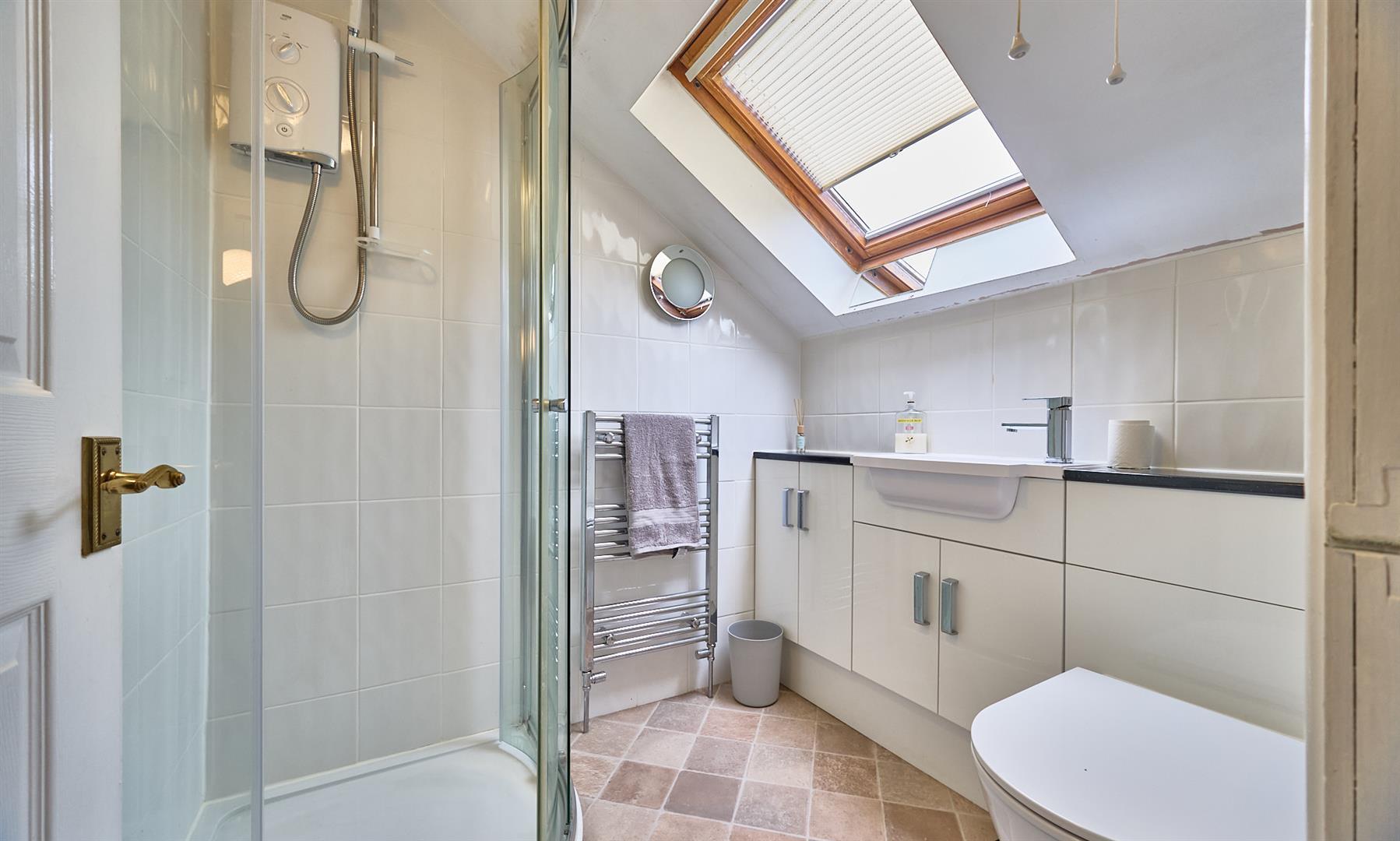 Tile effect vinyl flooring, vanity toilet unit with low level WC, vanity sink unit with sink and chrome mixer taps, corner shower enclosure with wall mounted Myra Electric shower, with tiled surrounds, chrome towel heater, Velux window.