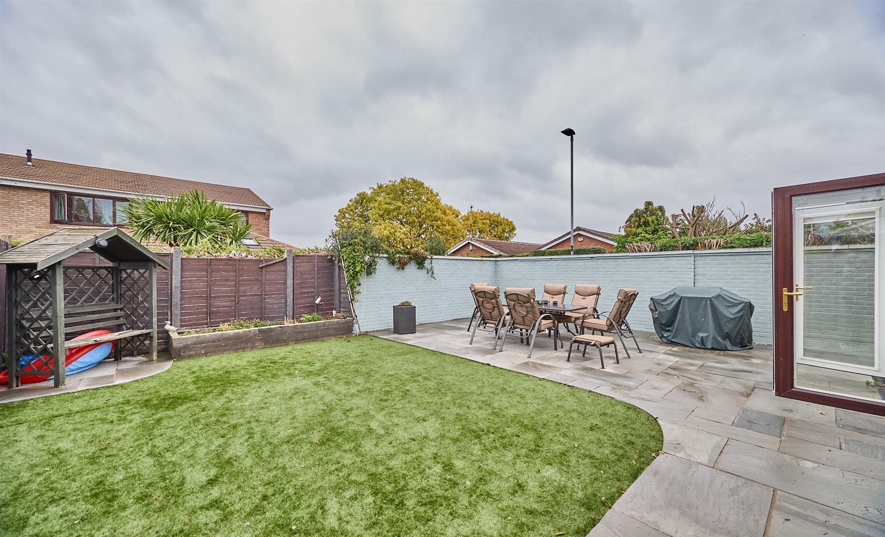 To the front of the property there is a large Tarmac Driveway leading to a double garage with white up and over door. Beyond the garage is a lean to storage area measuring 1.19m x 2.83m, a timber pedestrian gate to the rear garden which has a large limestone patio, the garden is predominantly laid to artificial lawn enclosed with fencing and brick built wall, raised timber beds and outside tap and lighting.