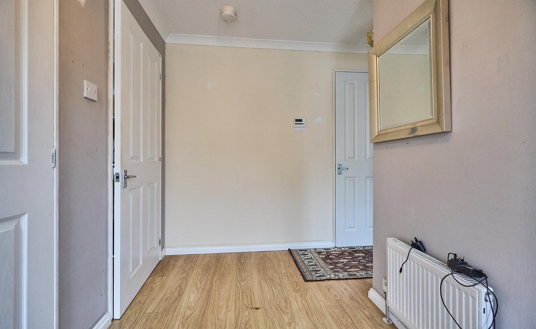With a laminate wood strip flooring and doors to useful storage covers with shelving, smoke alarm, thermostat for the central heating, and double panel radiator.