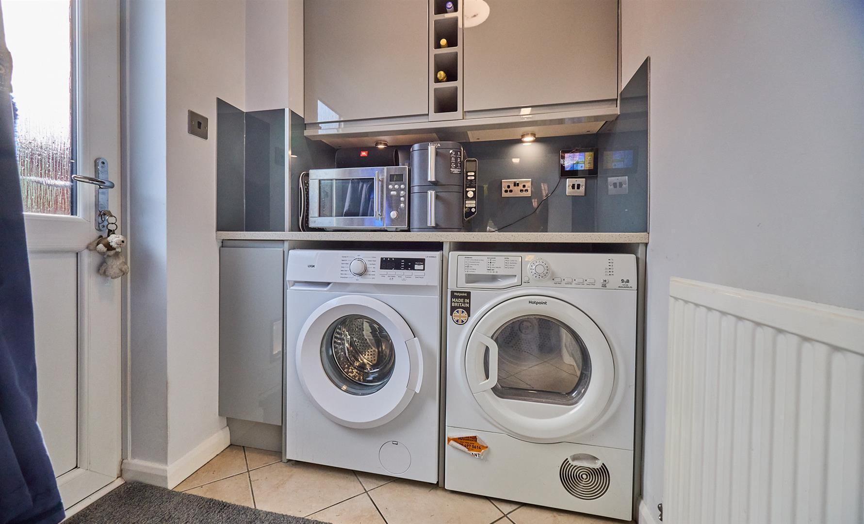 With matching units from the kitchen consisting of a white fitted Quartz working surface, cupboard beneath. Further wall mounted cupboard unit with central wine rack. Appliance recess points, plumbing for automatic washing machine, ceramic tiled flooring, radiator. UPVC SUDG door to the side of the property.