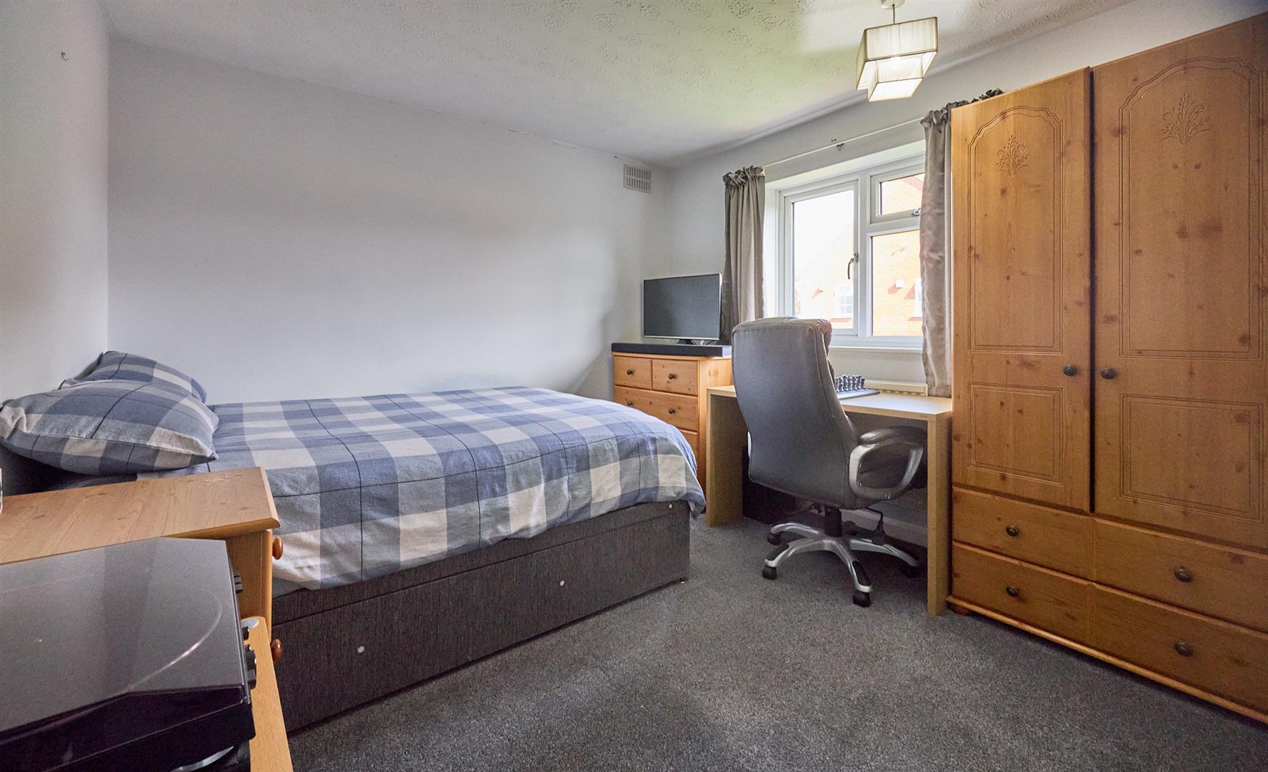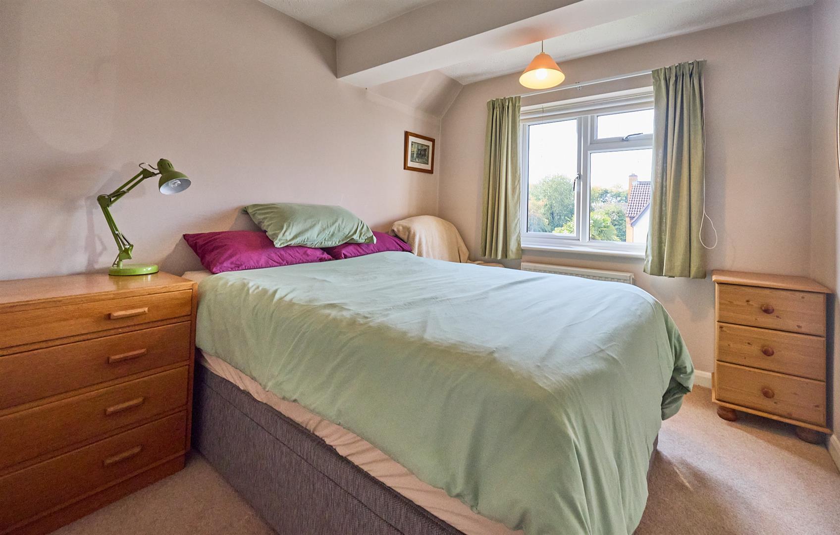 With Amtico wood grain flooring, range of fitted bedroom furniture in Beech consisting of one double and one single wardrobe unit, radiator. Door to