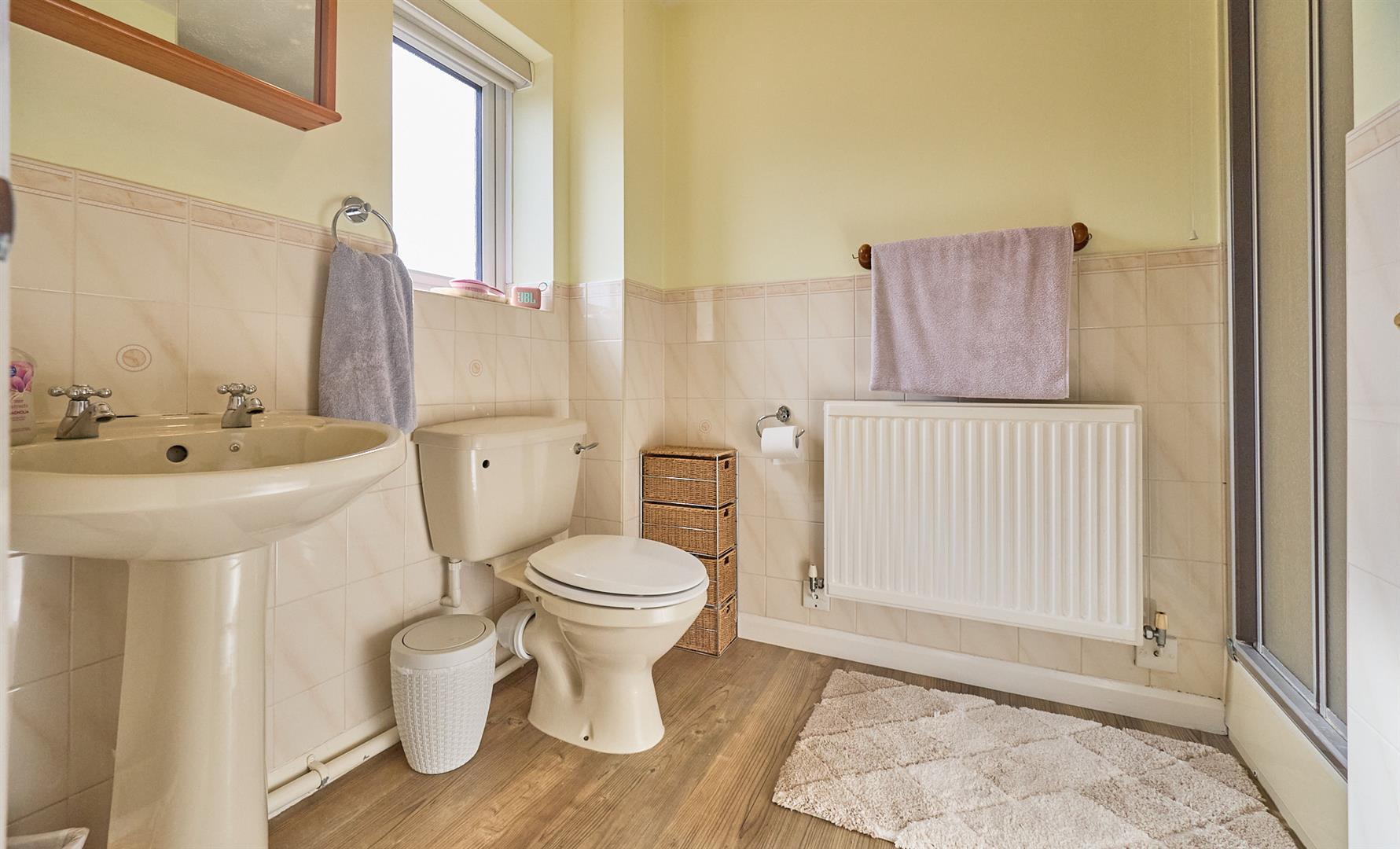 With panelled bath, electric shower unit above, pedestal wash hand basin and low level WC. Contrasting tiled surrounds, radiator, shaver point and extractor fan. Lino wood grain flooring.