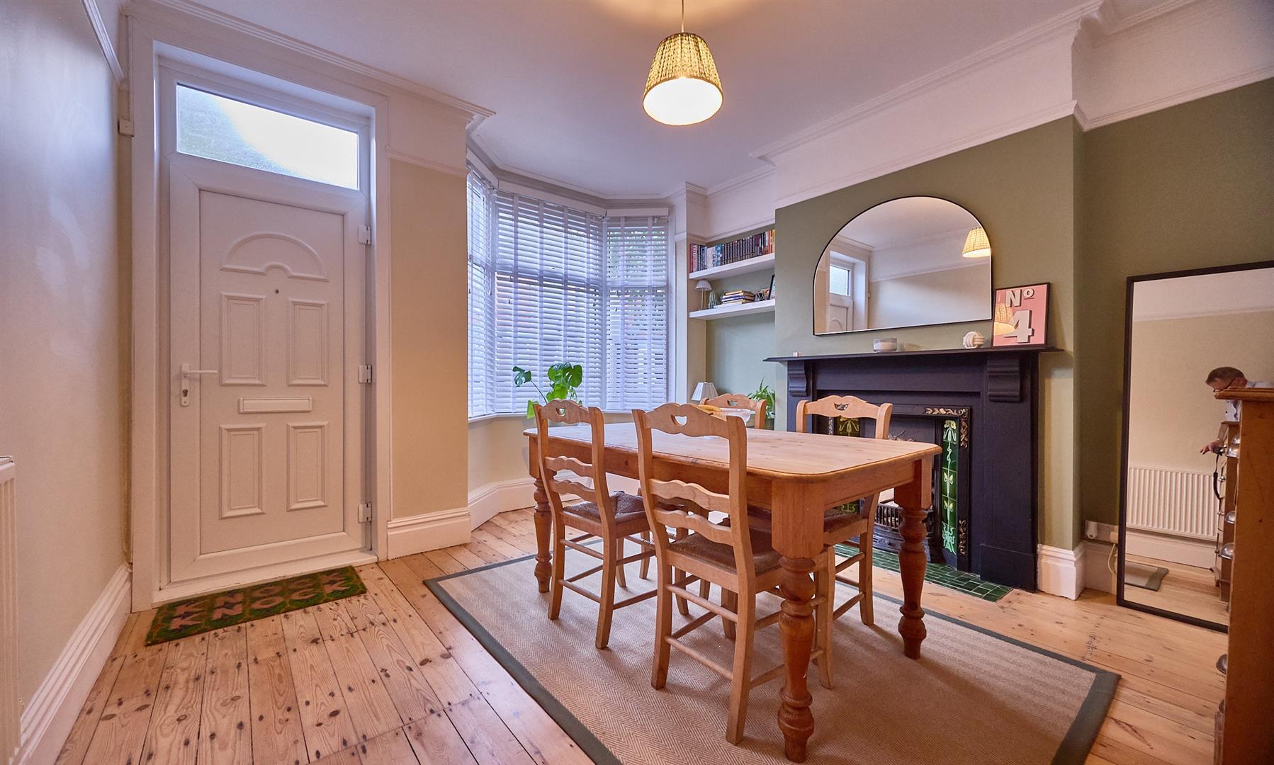 With feature original Victorian fireplace having ornamental black slate surrounds, ornamental cast iron and open fireplace with floral tiles and matching tiled hearth. Fitted gas meter cupboard and display shelving to side alcove. Original strip pine flooring, original coving and picture rail. Ceiling rose and radiator. Original strip pine panelled interior doors to