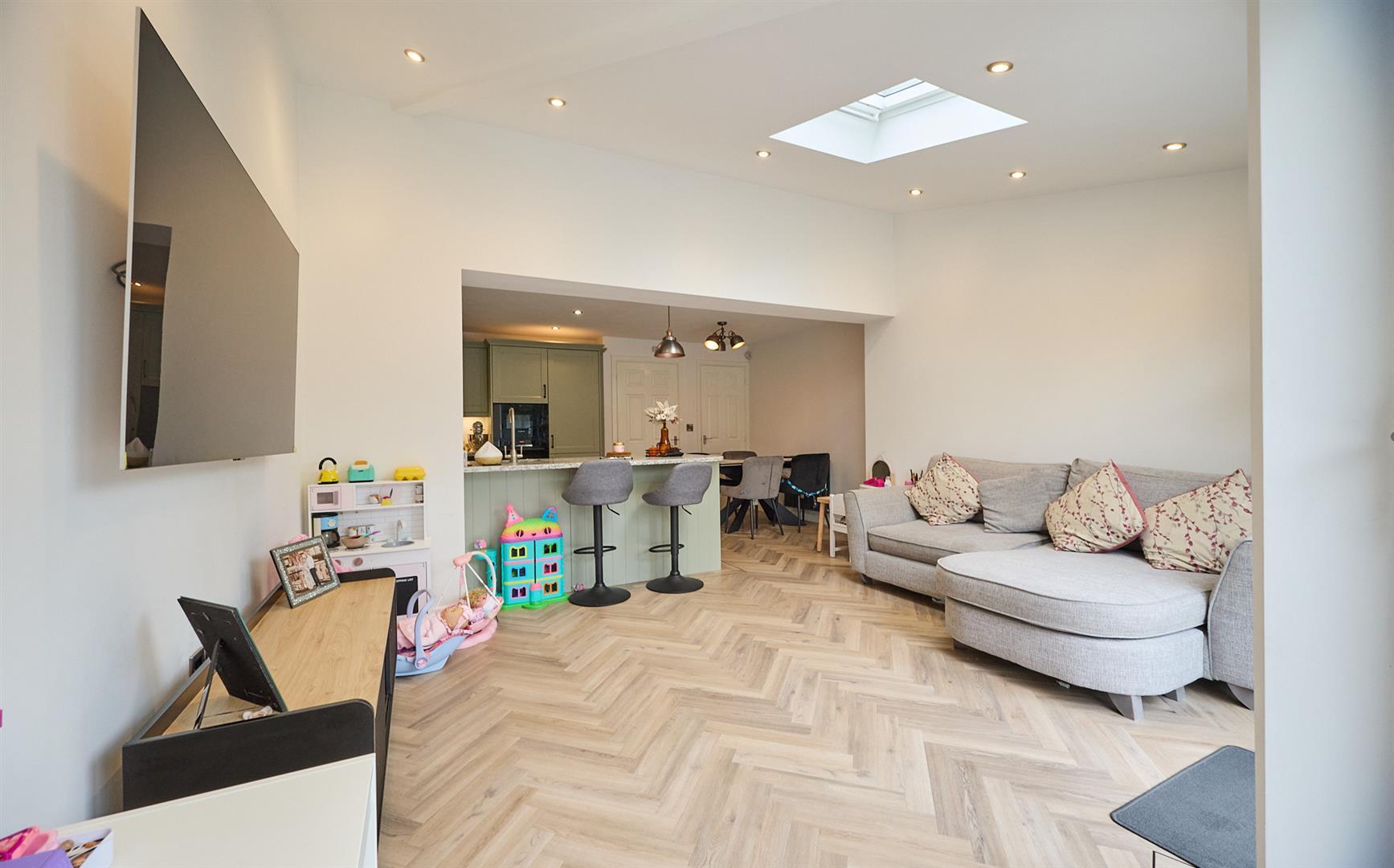 With LVT Herringbone flooring. A range of sage green floor standing fashionable kitchen cupboard units with black handles. Quartz working surfaces including breakfast bar including built in NEF dishwasher, Candy washing machine, Bosh oven and microwave. Wine fridge, fridge freezer, Lamona 4 ring gas hob with extractor fan above. Further matching range of wall cupboard units one housing the Ideal logic combination boiler for gas central heating and domestic water. Inset spot lights, door to under stairs storage cupboard. Two fashionable grey radiators. Two sets of black bi-folding doors to rear garden. Door to