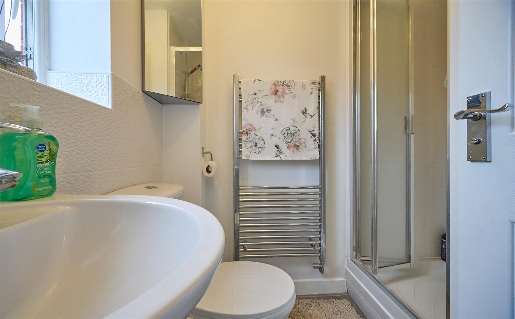 With white suite consisting fully tiled shower cubicle with glazed shower doors. Pedestal wash hand basin and low level WC. Contrasting tiled surrounds. Radiator and extractor fan. Shaver point.