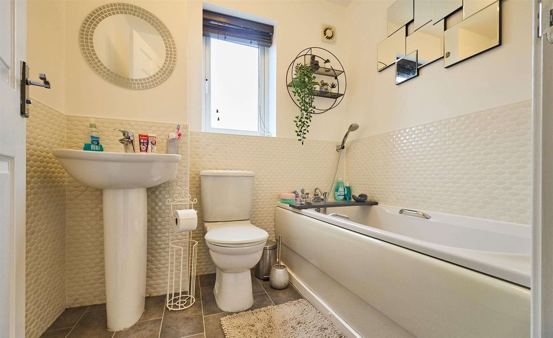 With white suite consisting panelled bath, pedestal wash hand basin and low level WC. Contrasting tiled surrounds. Vinyl flooring. Radiator and extractor fan.