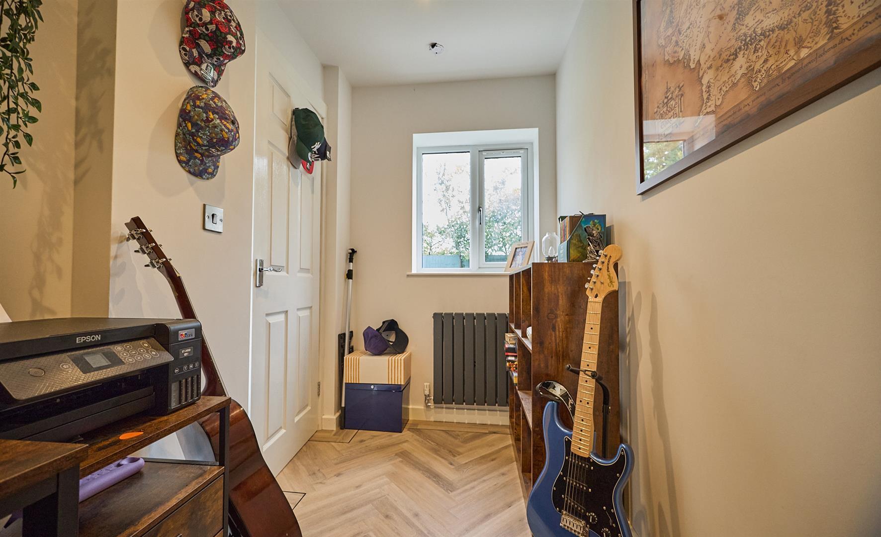 With Karndean wood grain flooring. Single panelled radiator. Doorbell chimes. Wired in smoke alarm. Keypad for burglar alarm system. Thermostat for central heating system. Stairway to first floor. Attractive white six panelled interior door to