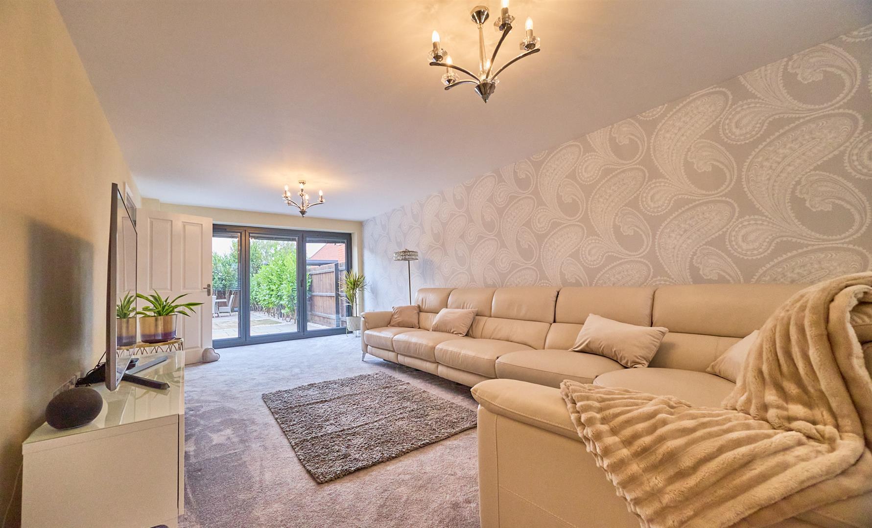 With two TV aerial point, double panelled radiator, full width three panel grey bi-folding doors to rear garden, grey upstanding fashionable radiator. Thermostat for central heating.