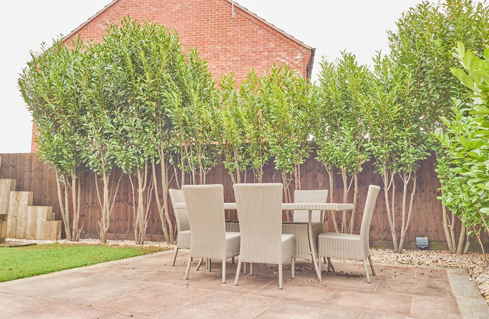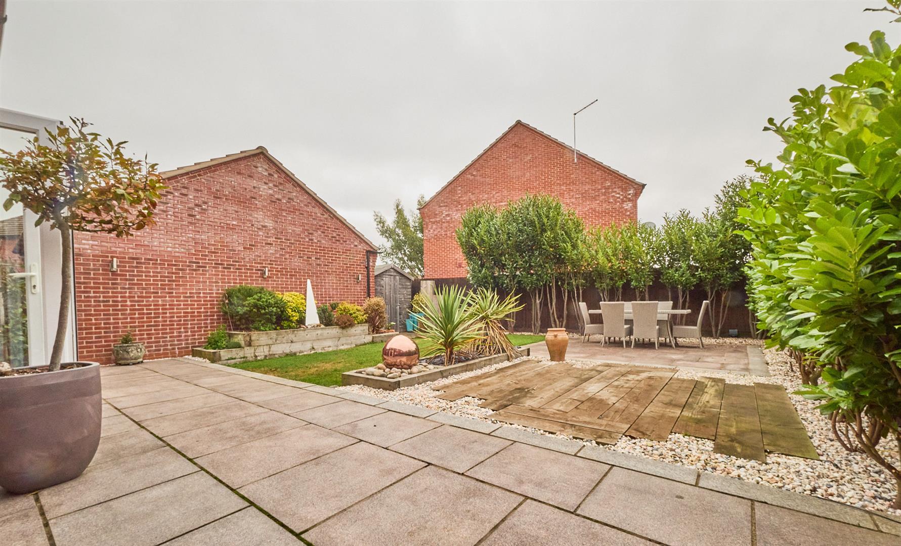 The property to front has a concrete slabbed path leading to the front door. The front garden is predominantly laid to artificial turf bordered by mature shrubs, there is a tarmacadam driveway leading to a single garage with electric door, electric and lighting, timber pedestrian gate to rear garden with slabbed patio adjacent to the rear of the house. The garden is well landscaped with further slabbed patio and timber sleeper patio, water feature, raised sleeper, mature beds and hedging. The garden is fenced and enclosed with timber shed, electric and lighting with outside water tap, there are also two water features in the garden.