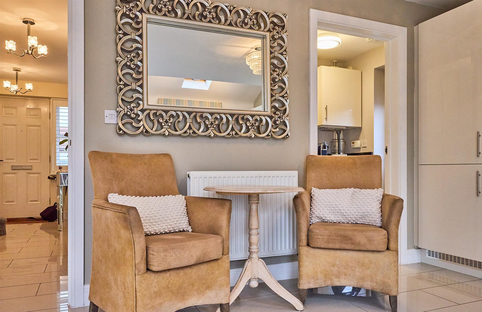 With tiled flooring, smoke alarm, doorbell chime, single panelled radiator. White shutter blinds which are included. Panelled door to under stairs storage cupboard housing the electrical fuse board.