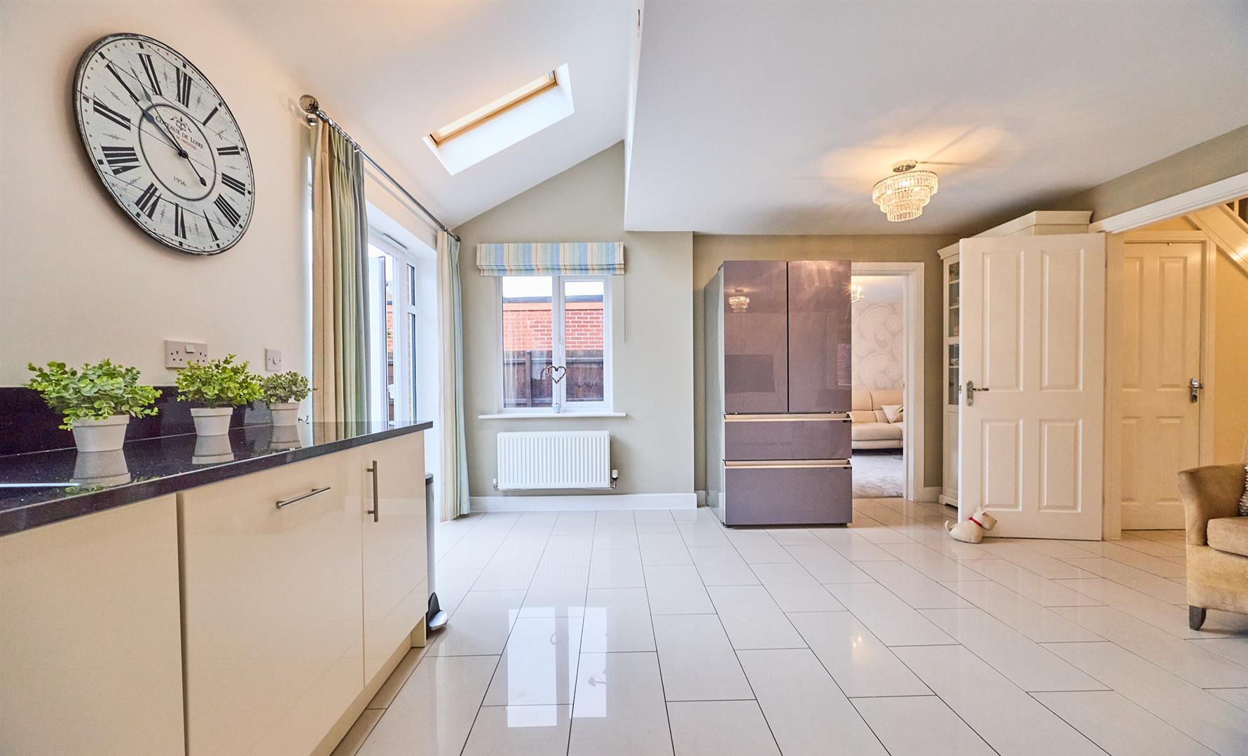 With tiled flooring, two double panelled radiators, a range of cream gloss fashionable floor standing kitchen cupboard units with granite working surfaces above, inset black resin sink unit, with mixer taps above. AEG ceramic induction hob, extractor hood above, double Samsung oven, doubling up as an air fryer and microwave. Built in Bosch dishwasher, built in fridge freezer. Further matching range of wall cupboard units, two Velux windows, inset ceiling spotlights. UPVC SUDG (Sealed unit double glazing) French doors to the rear garden.