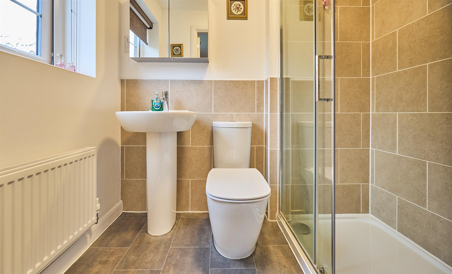 With white suite consisting of a fully tiled double shower cubicle with glazed shower doors, pedestal wash hand basin and low level WC. Contrasting tiled surrounds, radiator, wall mounted mirror fronted bathroom cabinet and extractor fan.
