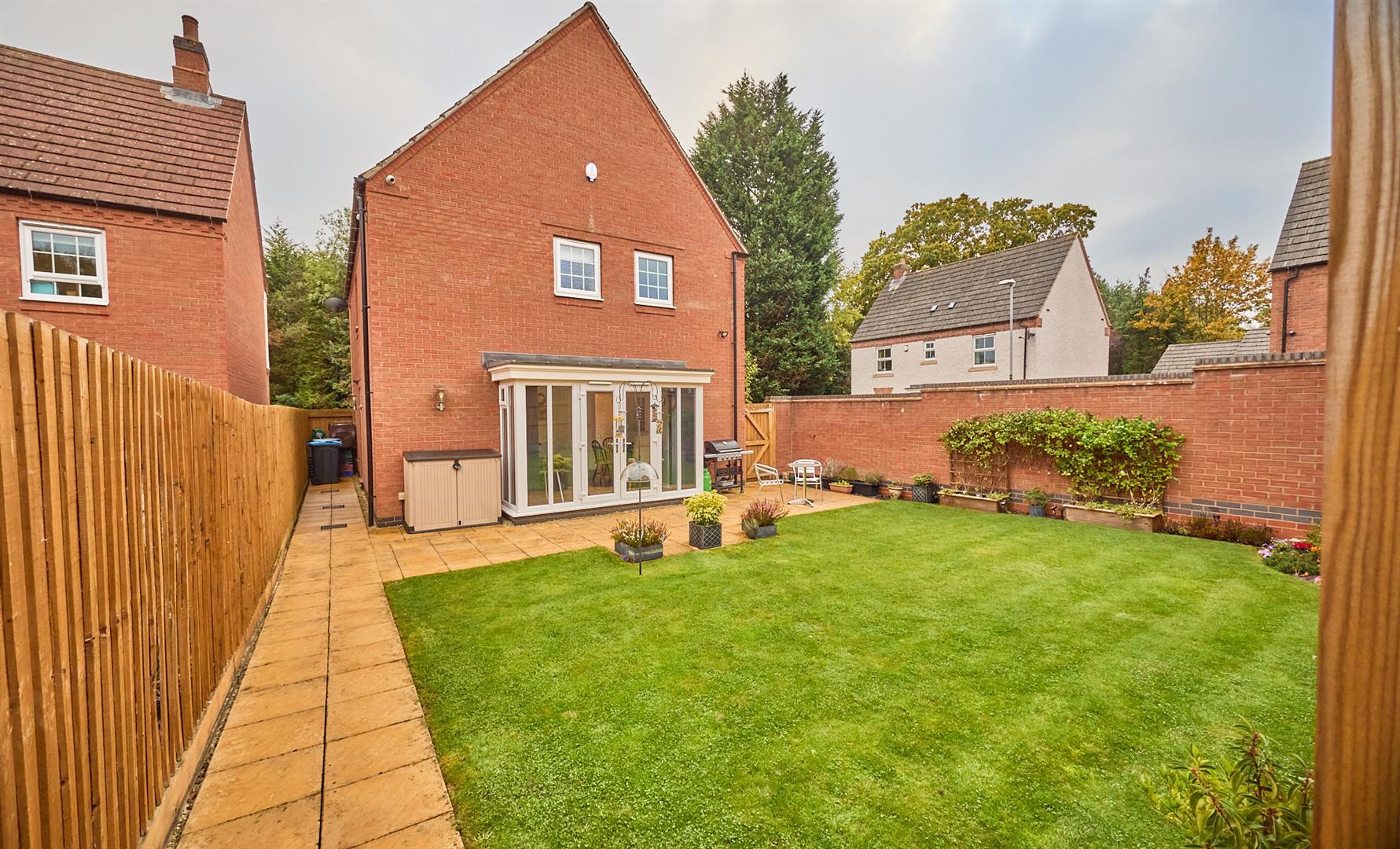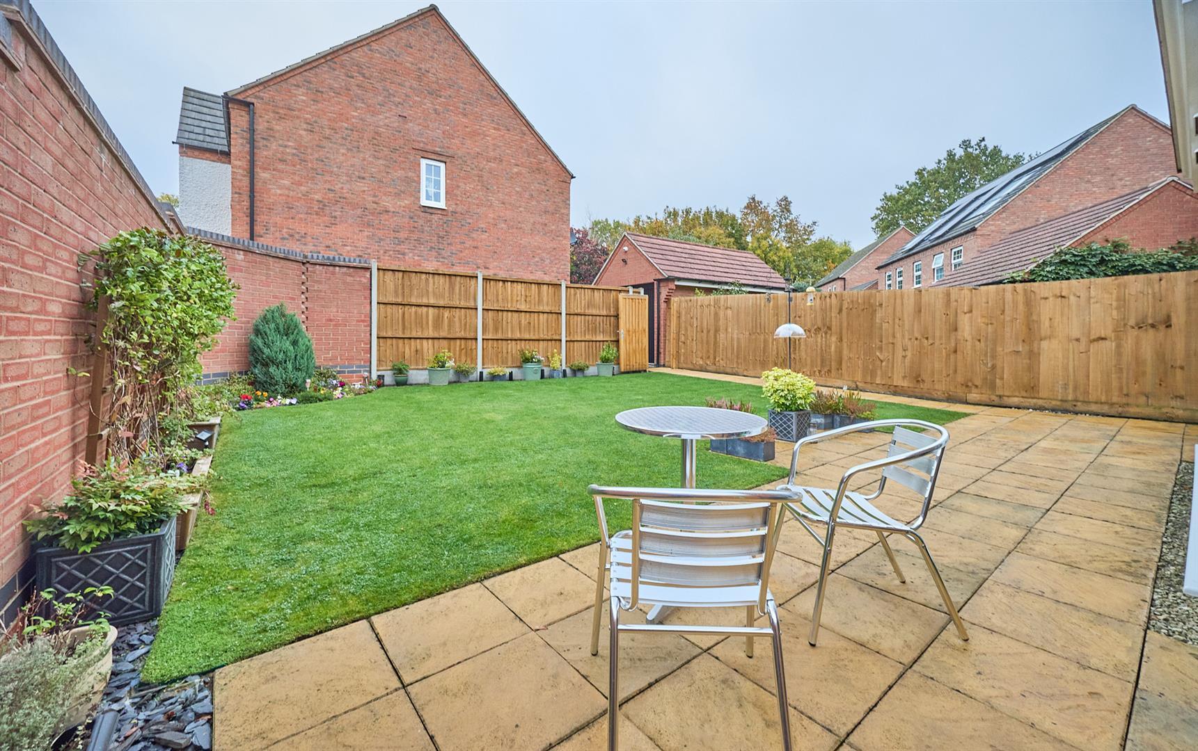 No Chain. Impressive 2015 award winning David Wilson built Cornell design detached family home overlooking greenery and greenbelt land to side. Sought after and convenient cul de sac development with good access to the village centre including shops, schools, doctors, dentist, restaurants, public house and fast easy access to the A5 and M69 motorway. Immaculate contemporary style interior with a range of good quality fixtures and fittings including white panelled interior doors, spindle balustrades, Karndean wood grain flooring, spotlights, wired in smoke alarms, alarm system, CCTV, gas central heating and UPVC SUDG. Spacious accommodation offers entrance hall, separate WC, lounge with feature contemporary fireplace, fitted open plan living dining kitchen and utility room. Four bedrooms (main with ensuite shower room) and family bathroom. Corner plot. Driveway to garage. Front, side and enclosed rear garden. Viewing recommended. Carpets, blinds, some light fittings and fitted wardrobes included.