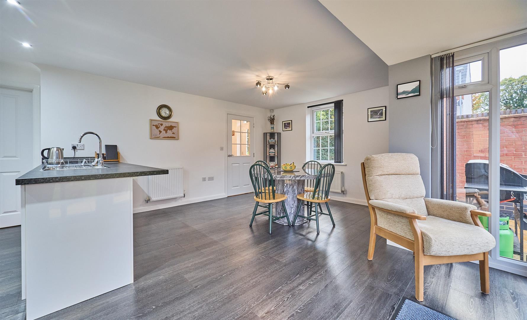 The living dining area: with Karndean wood grain flooring, two radiators UPVC SUDG French doors leading to the rear garden. Two TV aerial points and USB points.