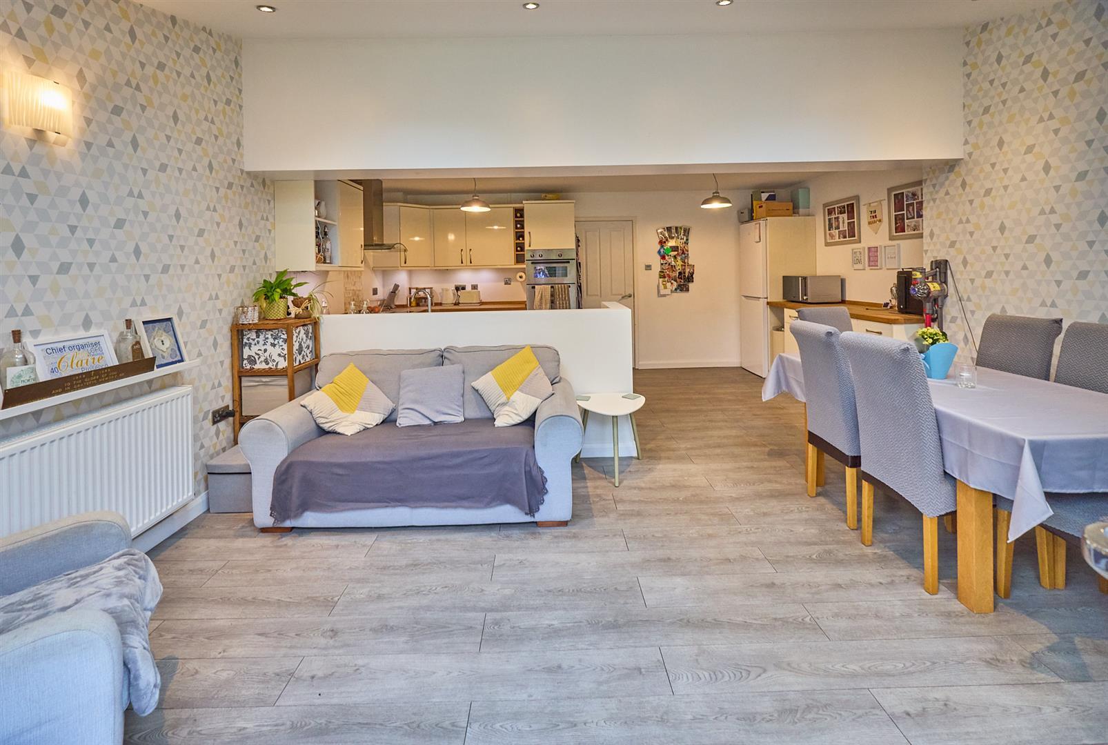 With grey wood finish laminate wood strip flooring, two radiators. Two matching wall lights, vaulted ceiling with two inset double glazed Velux windows and UPVC SUDG sliding patio doors to the rear garden.