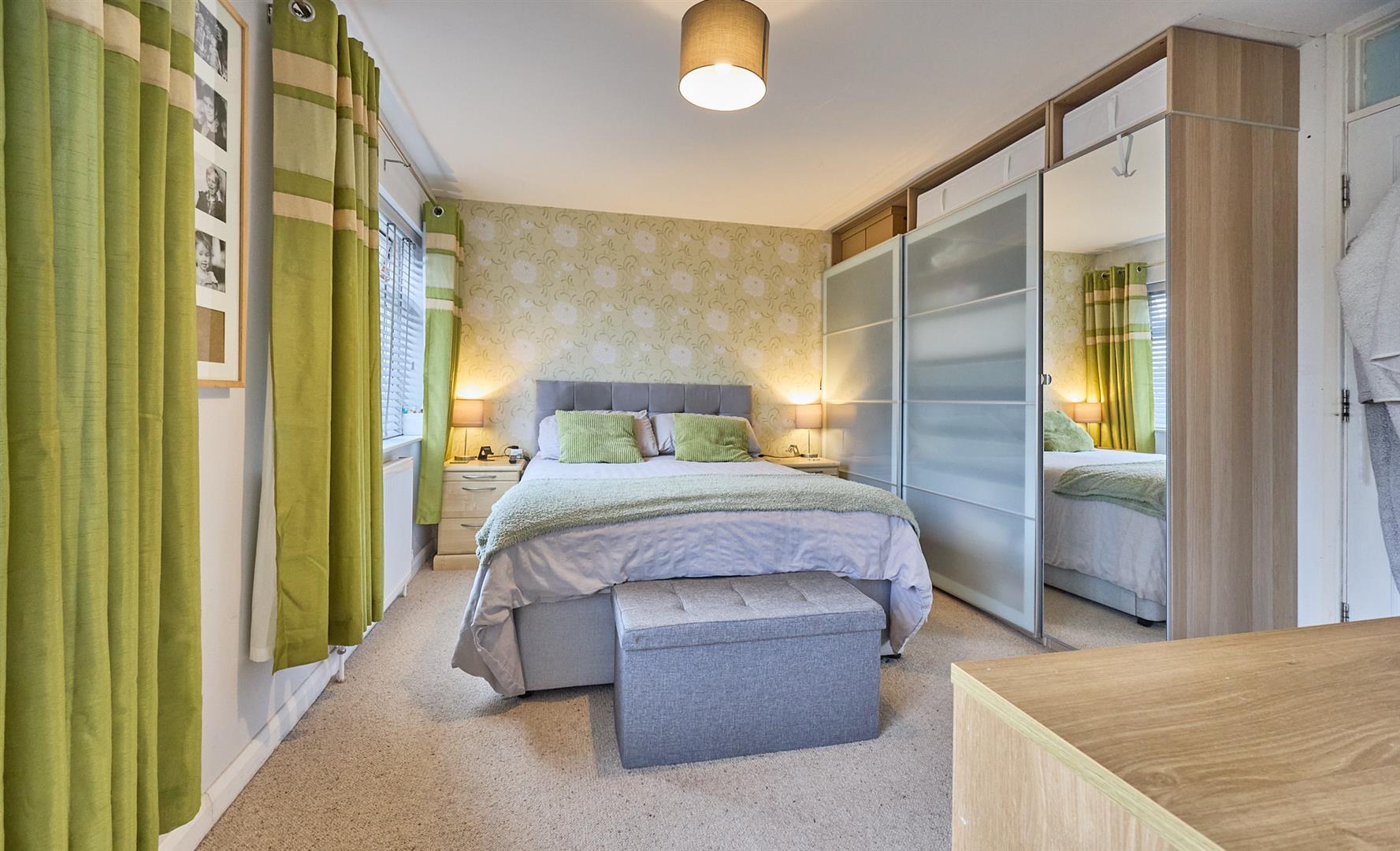 With a range of fitted bedroom furniture consisting of a double slide robe with smoke glass doors and further single wardrobe with mirrored glazed doors to front, shelving above. Built in dressing table in beech. Two radiators. Door to