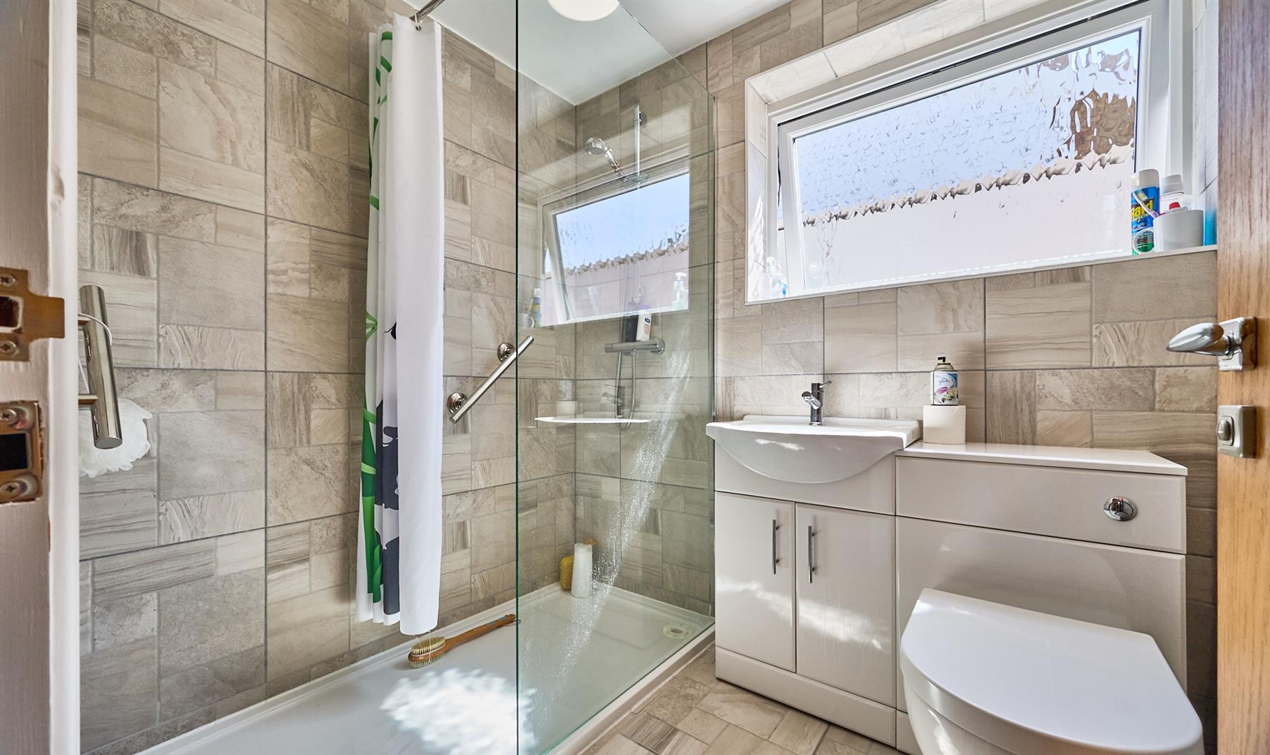 With tiled flooring, double vanity unit housing the low level WC and wash hand basin with chrome mixer taps, storage beneath. Large shower tray with glazed shower screen, bar shower above. Tiled surrounds, extractor fan, chrome heated towel rail and wall mounted heater.