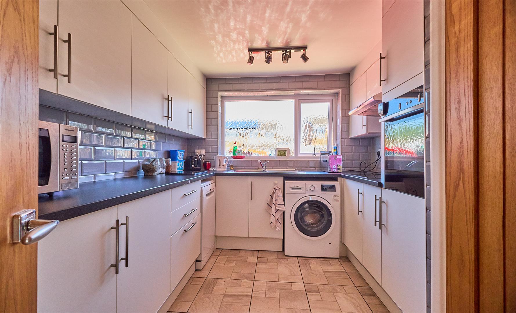 With tiled flooring, a range of floor standing gloss kitchen cupboard units with brushed chrome handles, slate effect working surfaces, stainless steel drainer sink with chrome mixer taps. Tiled splashbacks, freestanding dishwasher included. Integrated Neff oven four ring electric hob, extractor above, further matching range of wall cupboard units, plumbing for automatic washing machine. Door to useful storage cupboard with shelving. Door to