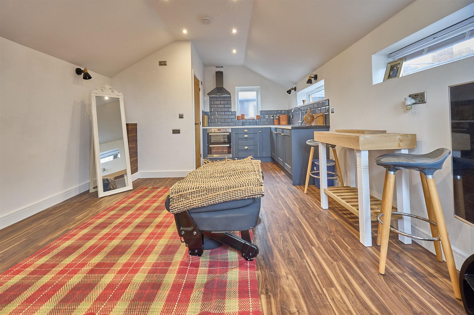 UPVC SUDG door to open plan bed sitting area with laminate strip flooring, two built in wardrobes in white, TV aerial point, all power points and light fittings are in brushed chrome with USB points. Two overhead bed lights. Vaulted ceiling with inset ceiling spot lights and wired in smoke alarm. The fitted kitchen area with a fashionable range of blue fitted kitchen units, soft closed doors, consisting inset grey single drainer resin sink unit, chrome mixer tap above, cupboard beneath. Further matching floor mounted cupboard units, three drawer unit, contrasting white marble finish work surfaces above with inset four ring ceramic hob unit, double fan assisted oven with grill beneath, black chimney extractor above. Also a integrated fridge and washing machine, laminate wood strip flooring. Oak panel interior doors lead to