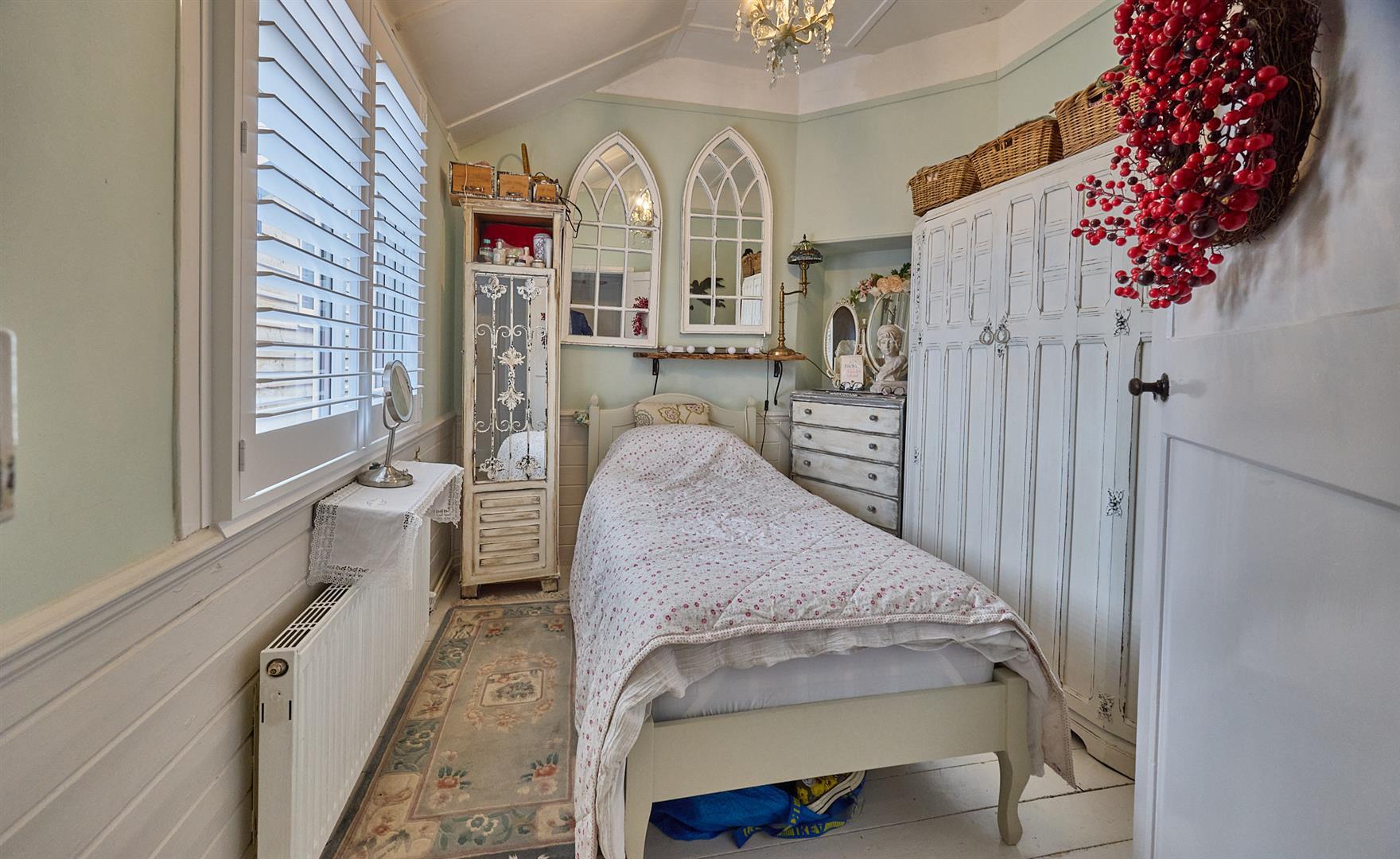 With a range of fitted bedroom furniture consisting of two tall storage cupboards, bridge of cupboards above the bed head and bedside tables, radiator.