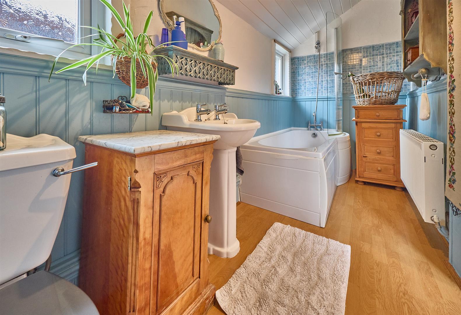 With white suite consisting of a panelled bath, mixer tap and shower attachment above, glazed shower screen side, pedestal wash hand basin, low level WC, wood finish laminate wood strip flooring. Painted tongue and groove wood panel surround, double panel radiator.