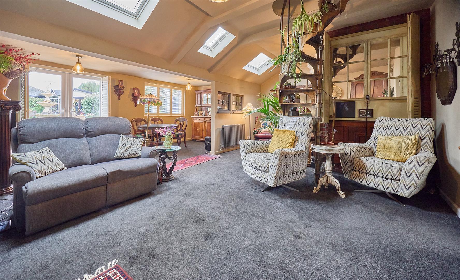 The lounge area with two feature fireplaces, one with a raised slate hearth with solid oak beam above incorporating a black cast iron multifuel stove. Built in full height corner cabinet and shelving to side alcove. Three SUDG velux windows in the roofline. The other feature fireplace with ornamental wooden pairing surrounds, raised wooden hearth incorporating a black cast iron multifuel stove, feature cast iron period style radiator. Feature cast iron spiral stairway leading to the loft. Feature archway leads to the dining area to rear. Feature interior colour leaded glazed interior windows. UPVC SUDG french doors leading to the rear garden with made to measure shutters.