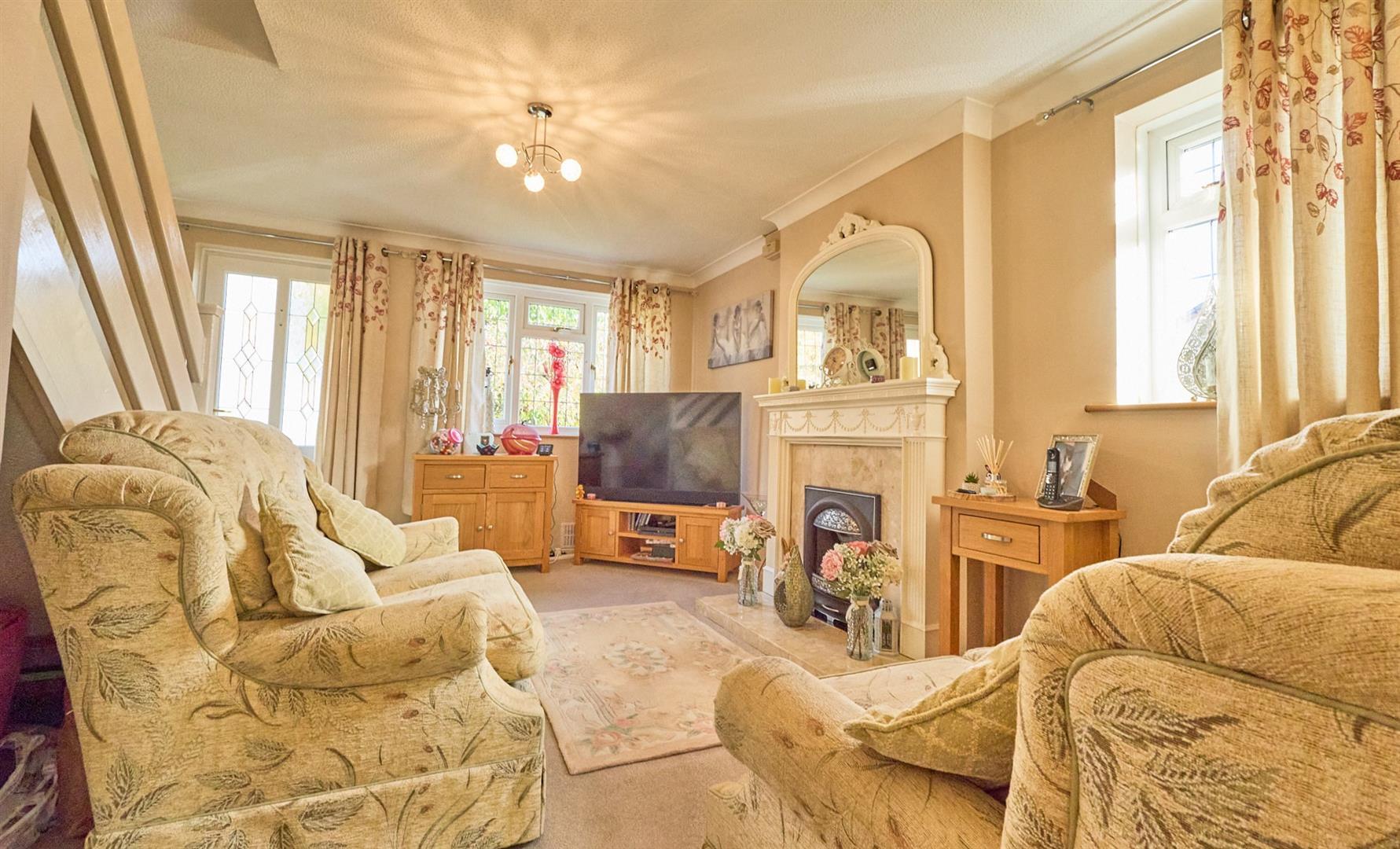 With feature fireplace having ornamental white wooden surrounds, raised marble hearth and back incorporating living flame coal effect gas fire. Radiator, TV aerial point including Sky. Coving to ceiling. Wall mounted consumer unit. Hive thermostat for central heating system. Stairway to first floor with useful under stairs storage cupboard beneath. White wood panel and glazed double doors to