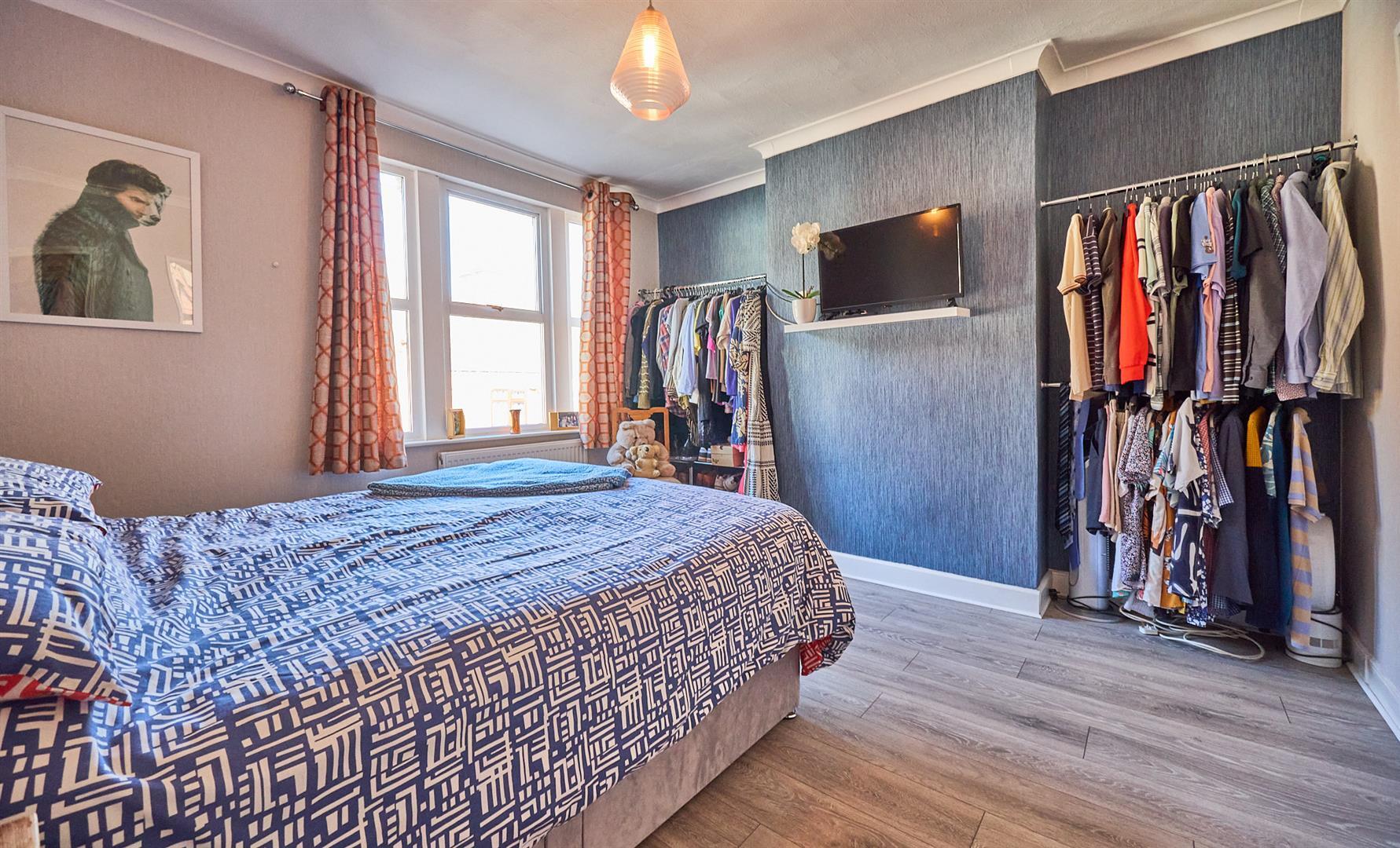 With feature original Victorian white cast iron fireplace, open hanging rails to side alcove, grey wood grain laminate strip flooring, radiator. Built in storage cupboard with fitted shelving over the stairway.