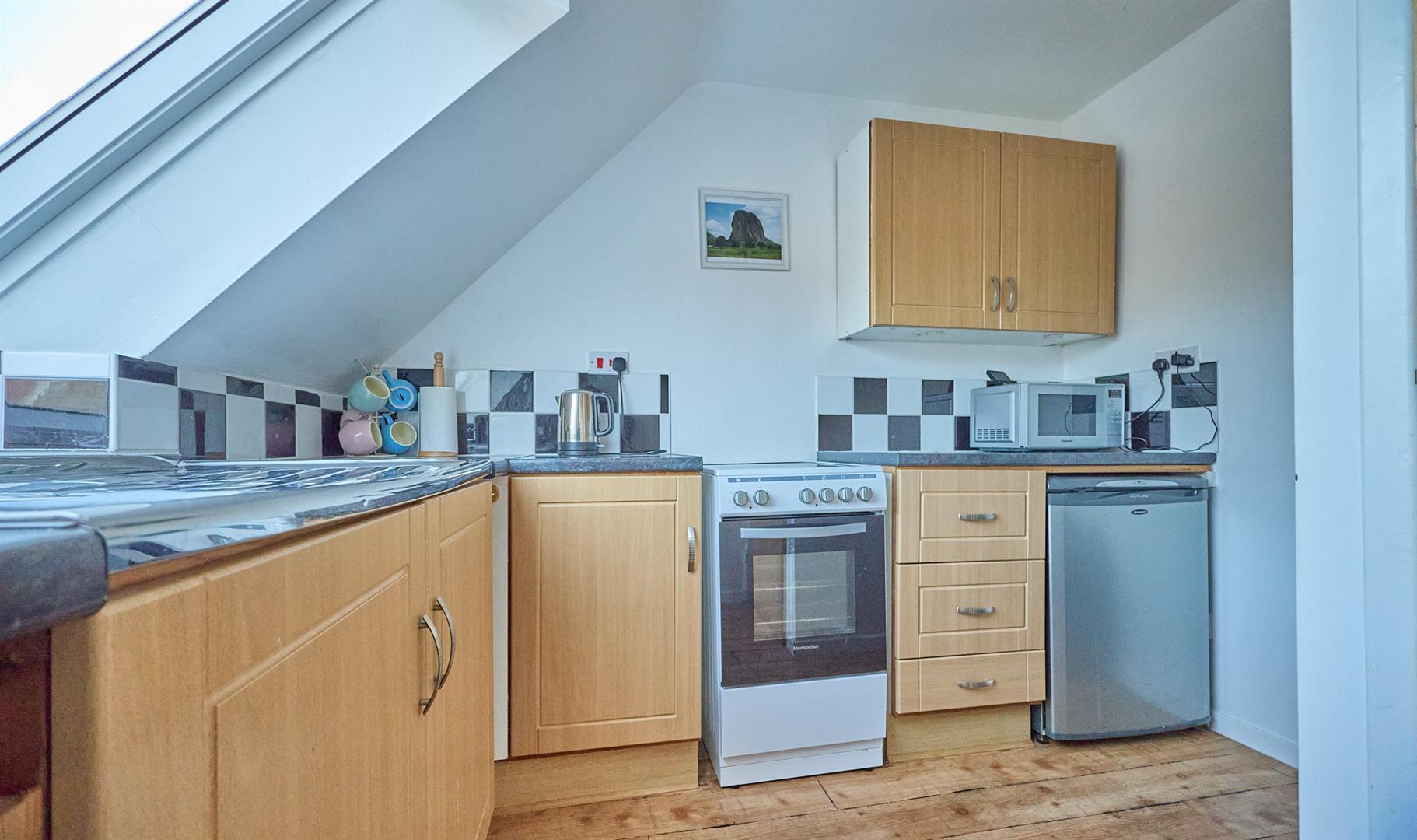 With a range of floor standing kitchen units with roll edge working surface above and an inset stainless steel drainer sink with mixer taps. White goods are included and includes a Beko washing machine, undercounter fridge and undercounter freezer and electric oven with hob. Further range of matching wall mounted cupboard units, tiled splashbacks and wood effect vinyl flooring.