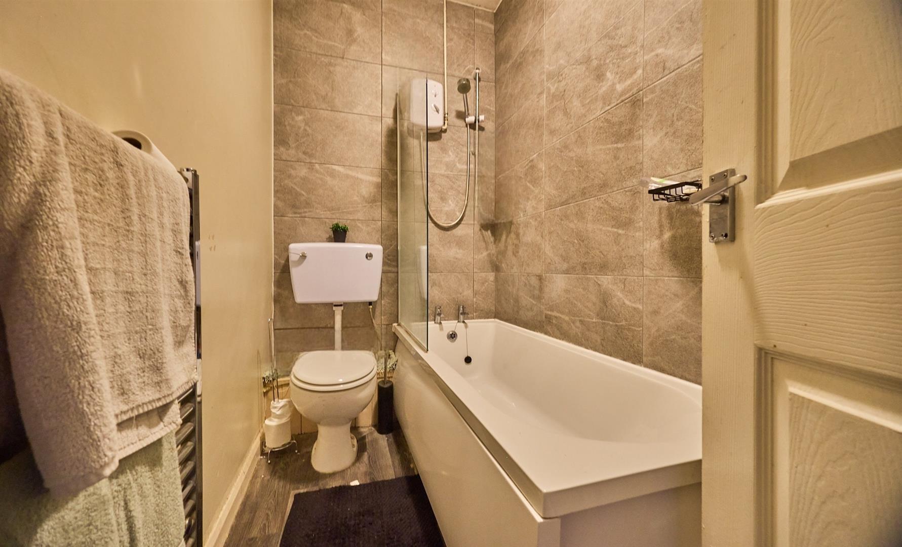 With white suite consisting panel bath, electric shower above, glazed shower screen to side, pedestal wash hand basin, low level WC. Contrasting tiled surrounds, chrome heated towel rail, extractor fan.