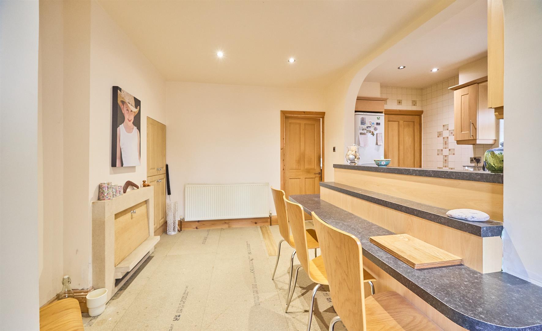 The kitchen area with a range of floor standing kitchen units with black roll edge working surfaces above, inset stainless steel sink with mixer tap above and cupboard beneath. Bosch dishwasher and a cooker with four ring gas hob, extractor hood above and electric oven and grill beneath. Further drawer units and tiled flooring, further range of wall mounted cupboard units and tiled splashbacks and fridge freezer which is included. Doors to useful under stairs storage cupboard which houses the electric meter as well as the electric consumer unit. There is a breakfast bar with four wooden chairs included. There is a feature composite fireplace with a gas fire and fitted cupboards and shelves to side alcove, inset ceiling spotlights. The dining area is in need of flooring. Double panel radiator, archway through to