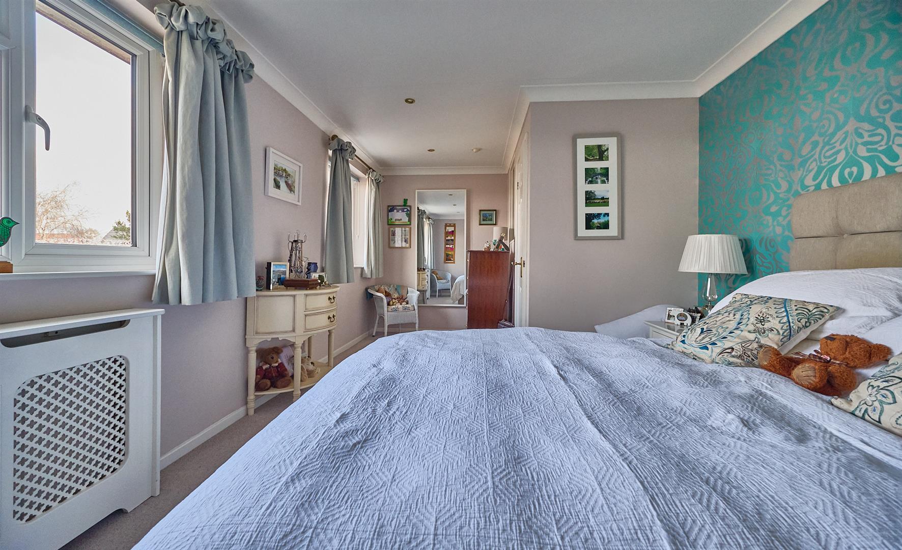 With a range of fitted wardrobes consisting three double wardrobes with rails and shelving, coving to ceiling, single panelled radiator. Attractive white panelled interior door to