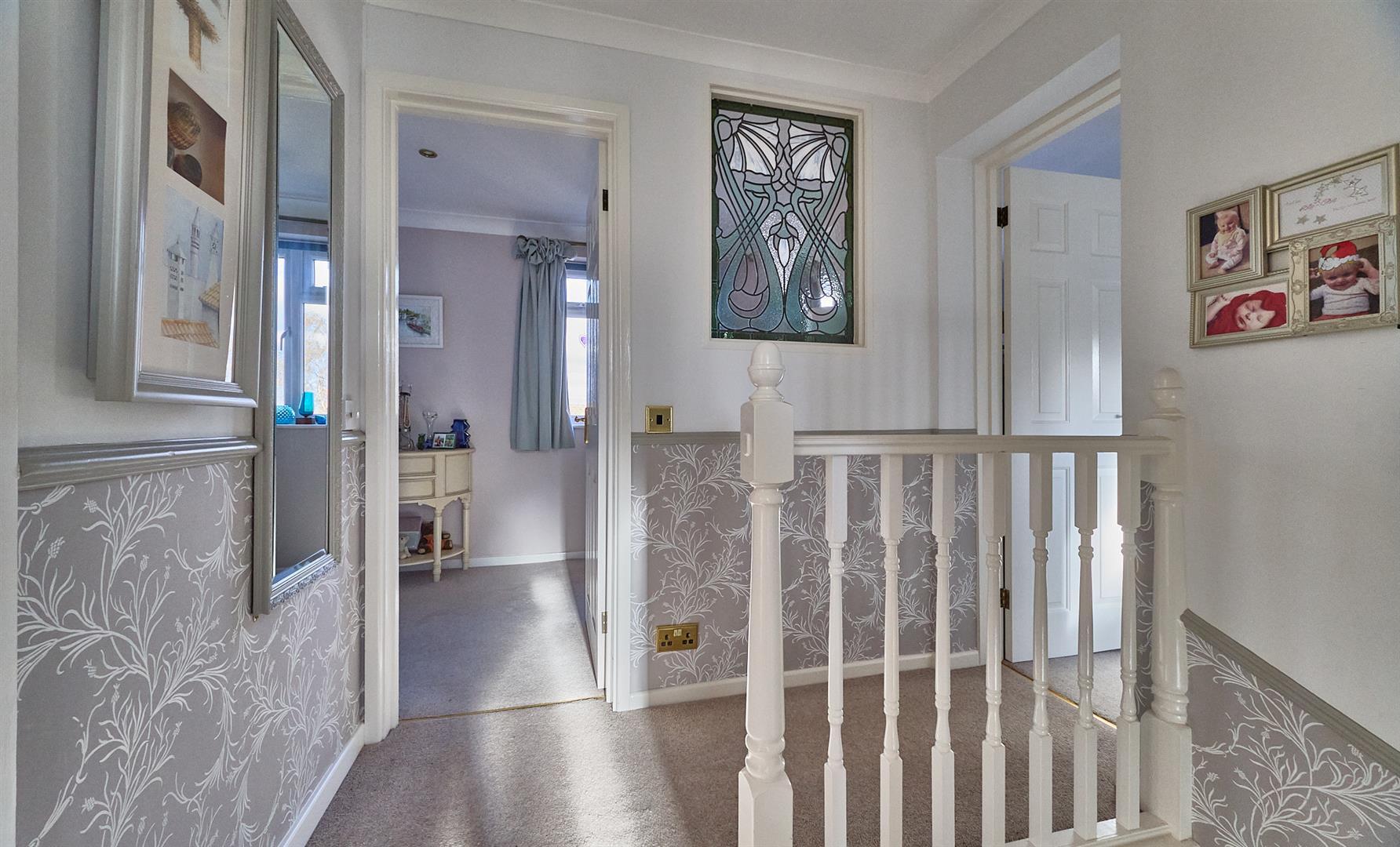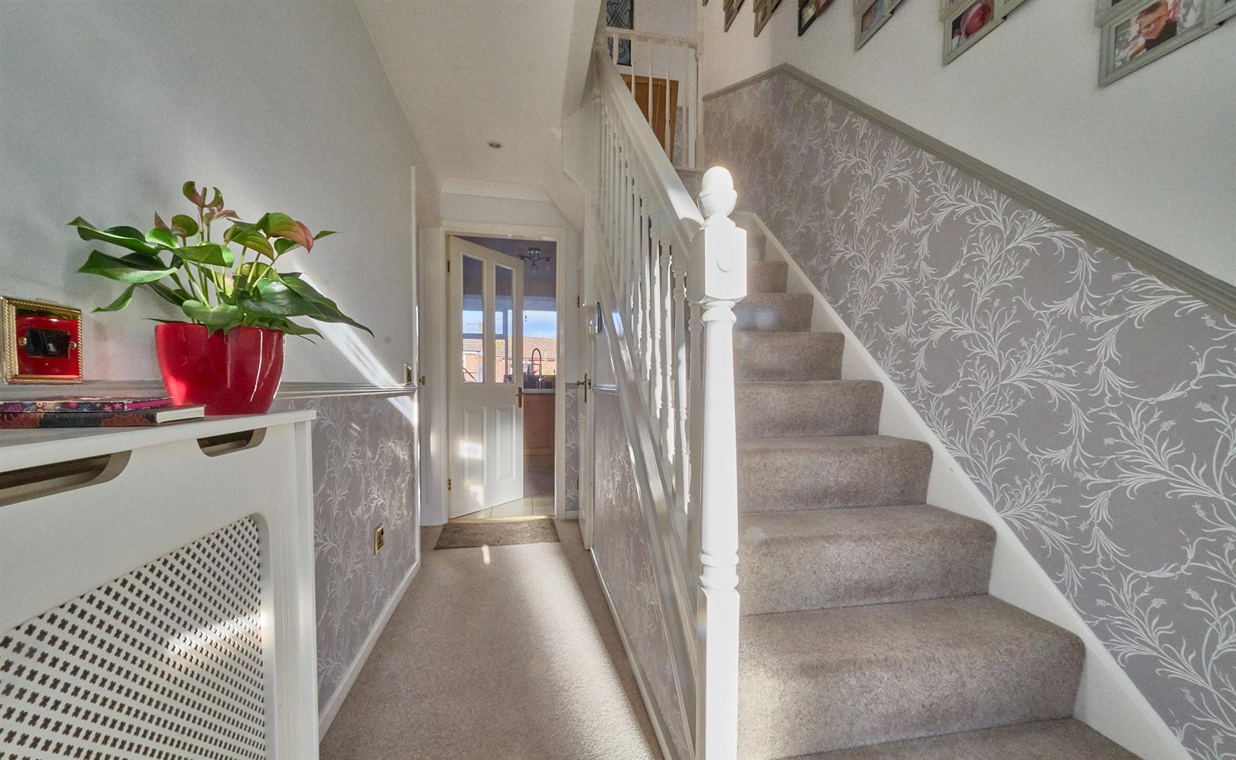 With stairway to first floor with spindle balustrades, single panelled radiator with ornate radiator cover and picture rails and coving to ceiling, inset ceiling spotlights. Thermostat for the central heating system. Attractive white panelled interior door to useful under stairs storage cupboard which houses the electric consumer unit. Attractive white panelled interior door to