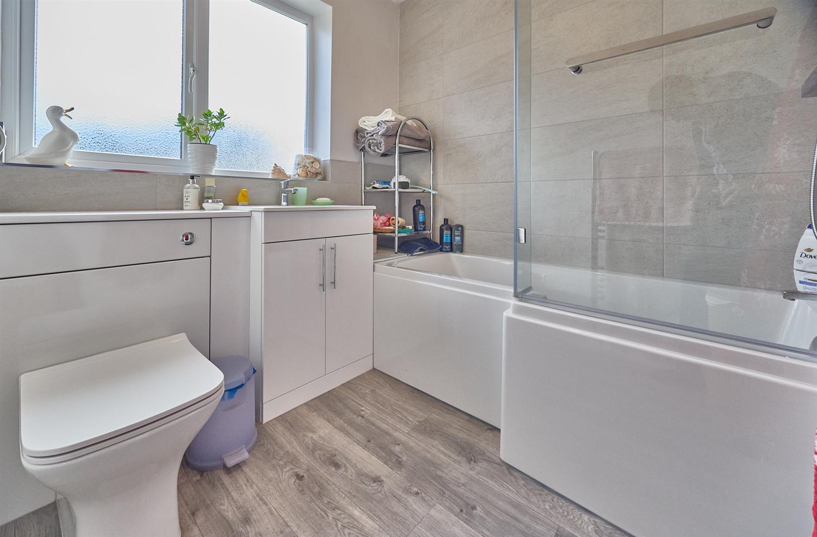 With refitted white suite consisting low level WC, vanity sink unit with gloss white cupboards beneath, tiled splashbacks, ceramic tiled flooring. Radiator and extractor fan.