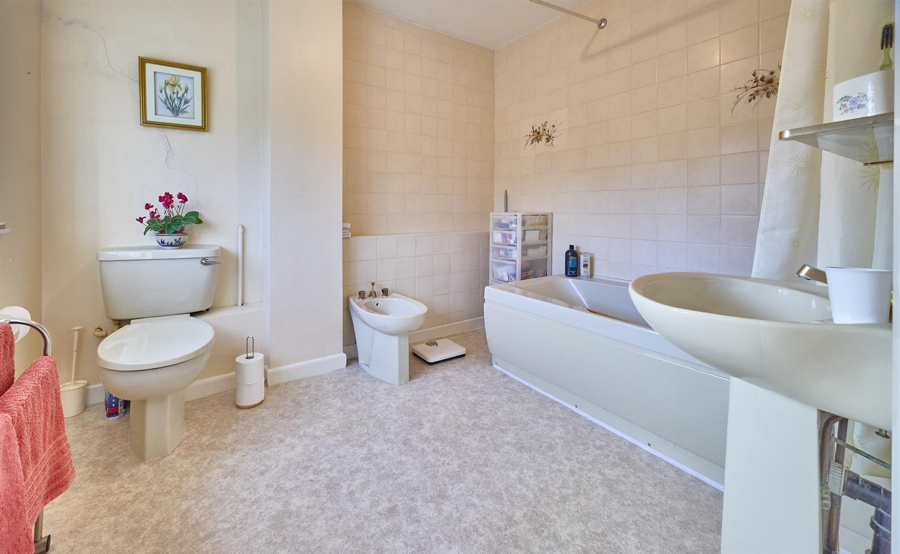 With panelled bath, electric shower unit above, pedestal wash hand basin and low level WC and bidet. Contrasting tiled surrounds and radiator.