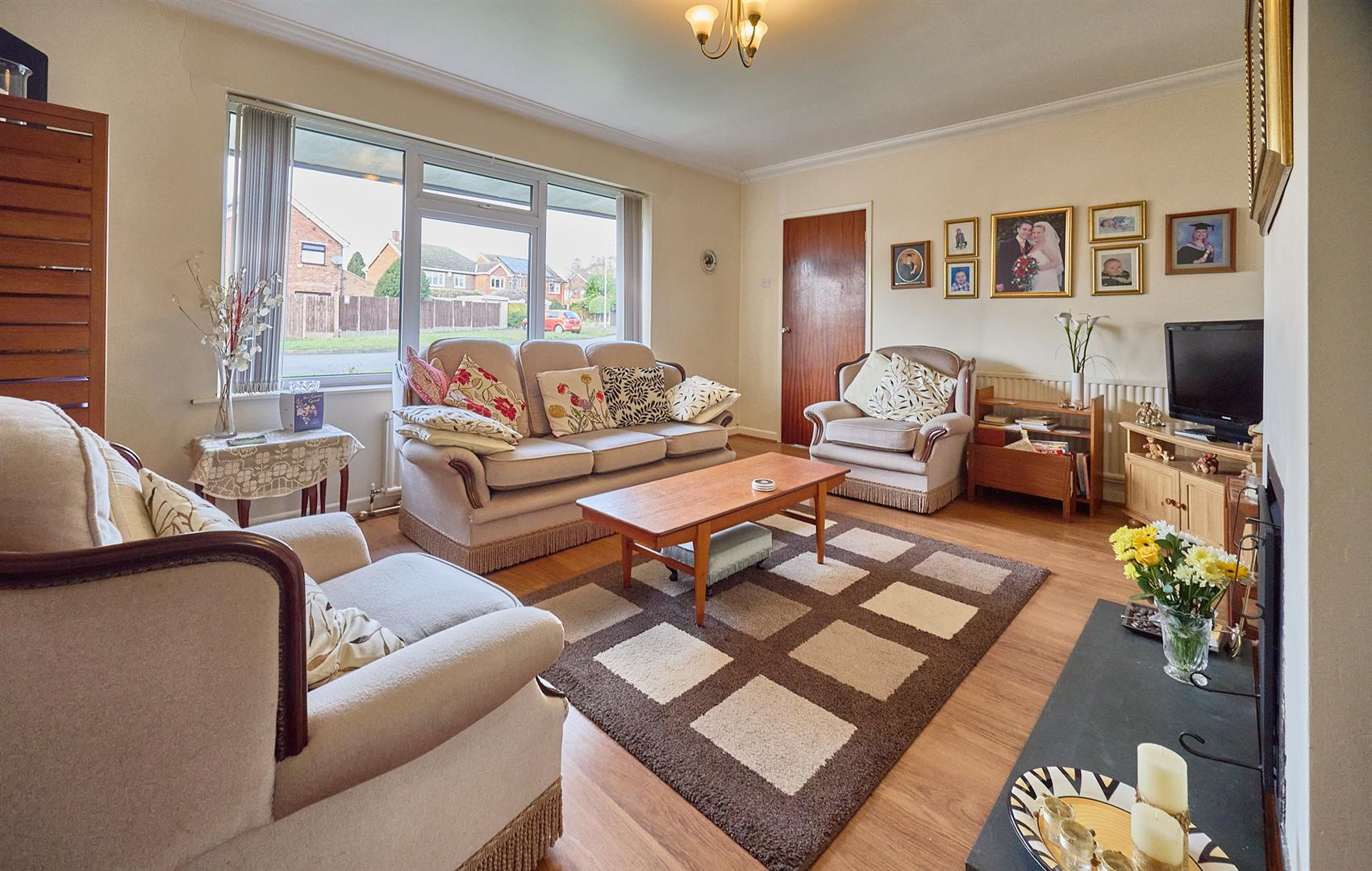 With oak finish laminate wood strip flooring, coving to ceiling, radiator. UPVC SUDG French doors to a UPVC SUDG conservatory.