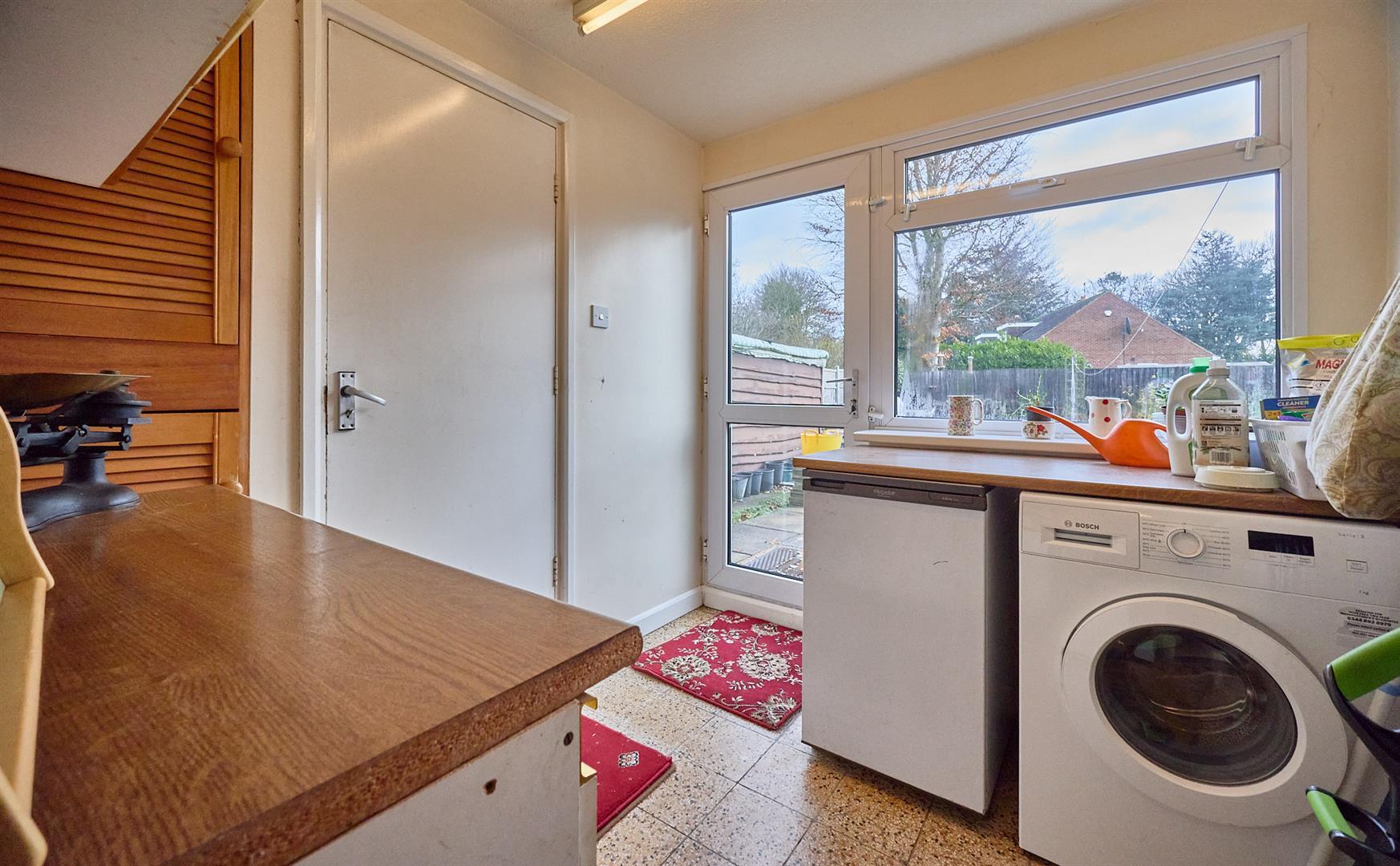 With a range of fitted units consisting one double floor mounted cupboard unit, roll edge working surfaces above, appliance recess points, plumbing for automatic washing machine. Further wall mounted cupboard units, Terazzo tiled flooring. UPVC SUDG door leading to the rear garden. Door to rear of tandem garage.