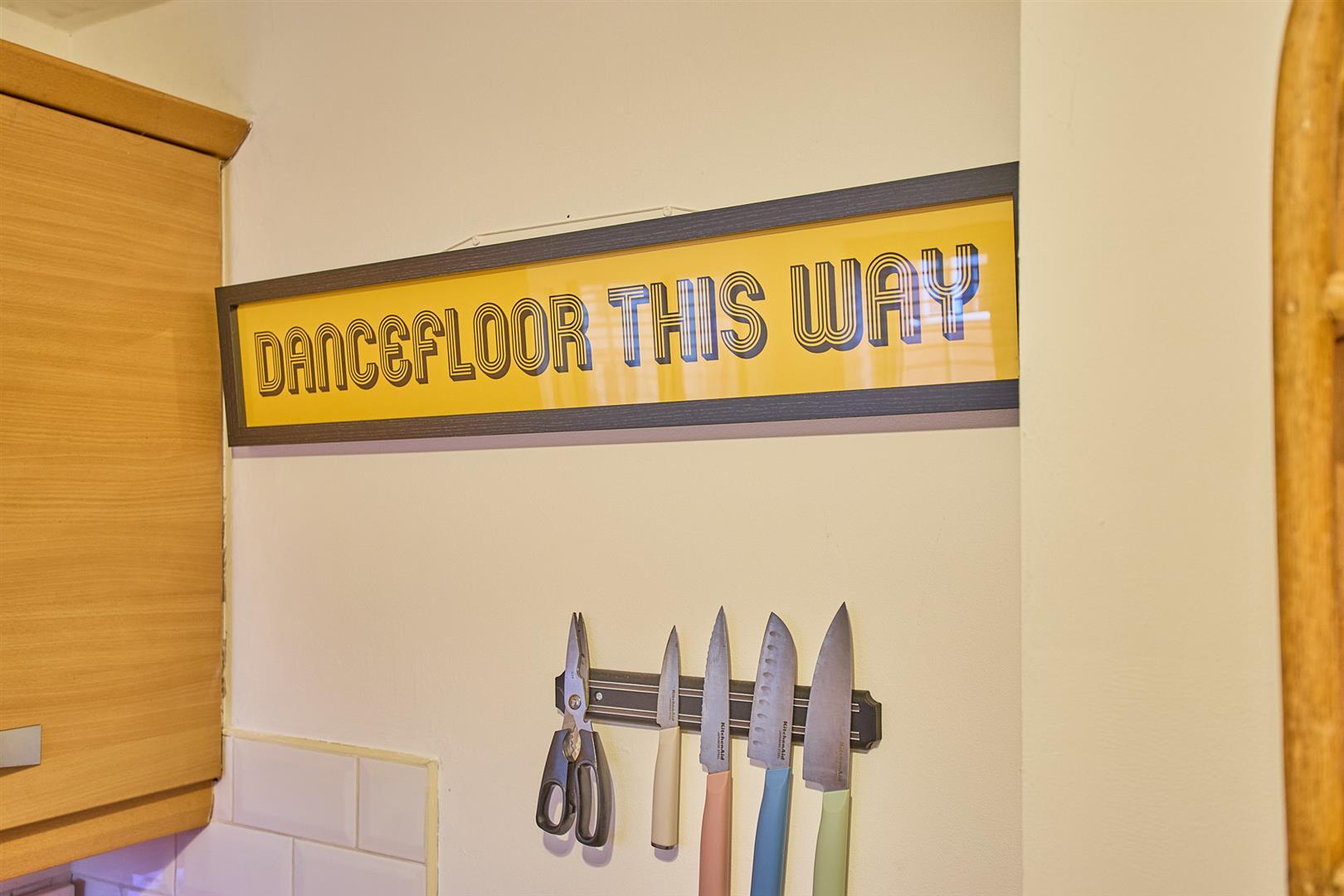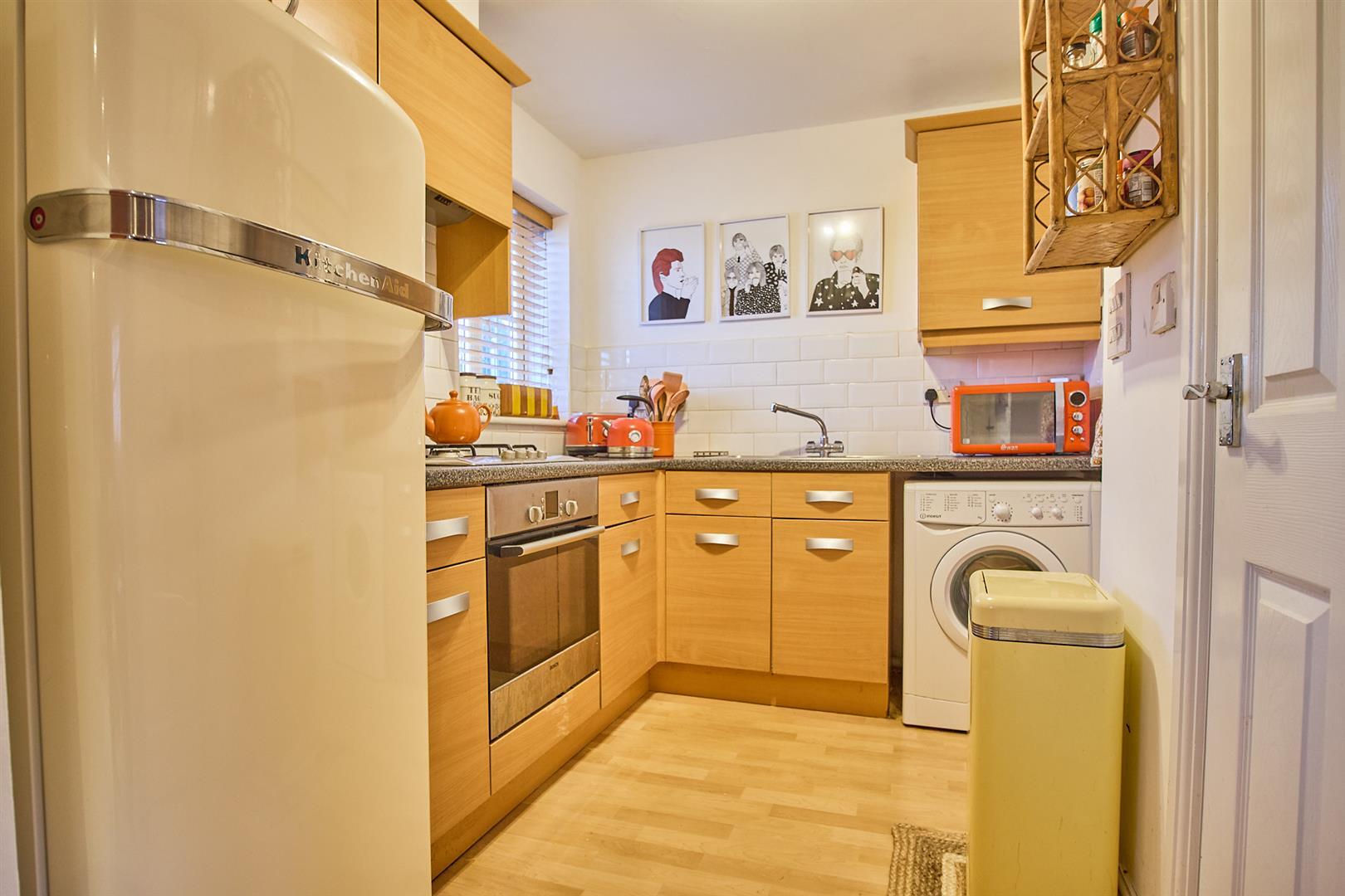 with a range of maple finish fitted kitchen units consisting inset single drainer stainless steel sink unit with mixer taps above, double base unit beneath. Further matching floor mounted cupboard units and drawer. Contrasting grey roll edge working surfaces above with inset four ring stainless steel gas hob unit. Single fan assisted oven with grill. Integrated extractor hood. White tiled splashbacks. Further matching wall mounted cupboard units. Appliance recess points. Plumbing for automatic washing machine (washing machine & fridge freezer included). Digital programmer for central heating and domestic hot water. Laminate wood strip flooring. Door to the airing cupboard housing the lagged copper cylinder fitted immersion heater for supplementary domestic hot water.