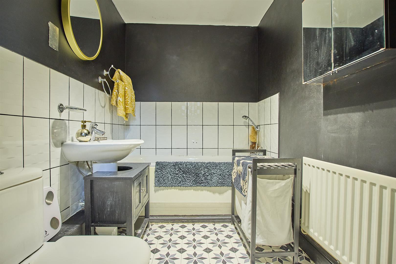 with white suite consisting panelled bath, mixer tap and shower attachment above. Pedestal wash hand basin. Low level WC. Contrasting tiled surrounds. Radiator. Extractor fan. Bathroom fittings include mirror fronted bathroom cabinet.