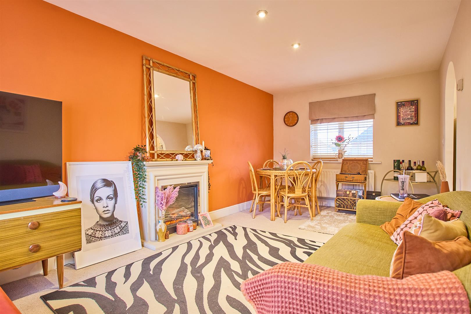 with feature contemporary fireplace having ornamental cream wooden surrounds incorporating a living flame log effect electric fire. Two double panelled radiators. TV aerial point, including BT. Inset ceiling spotlights. Thermostat for central heating system. Telephone point. Feature archway to