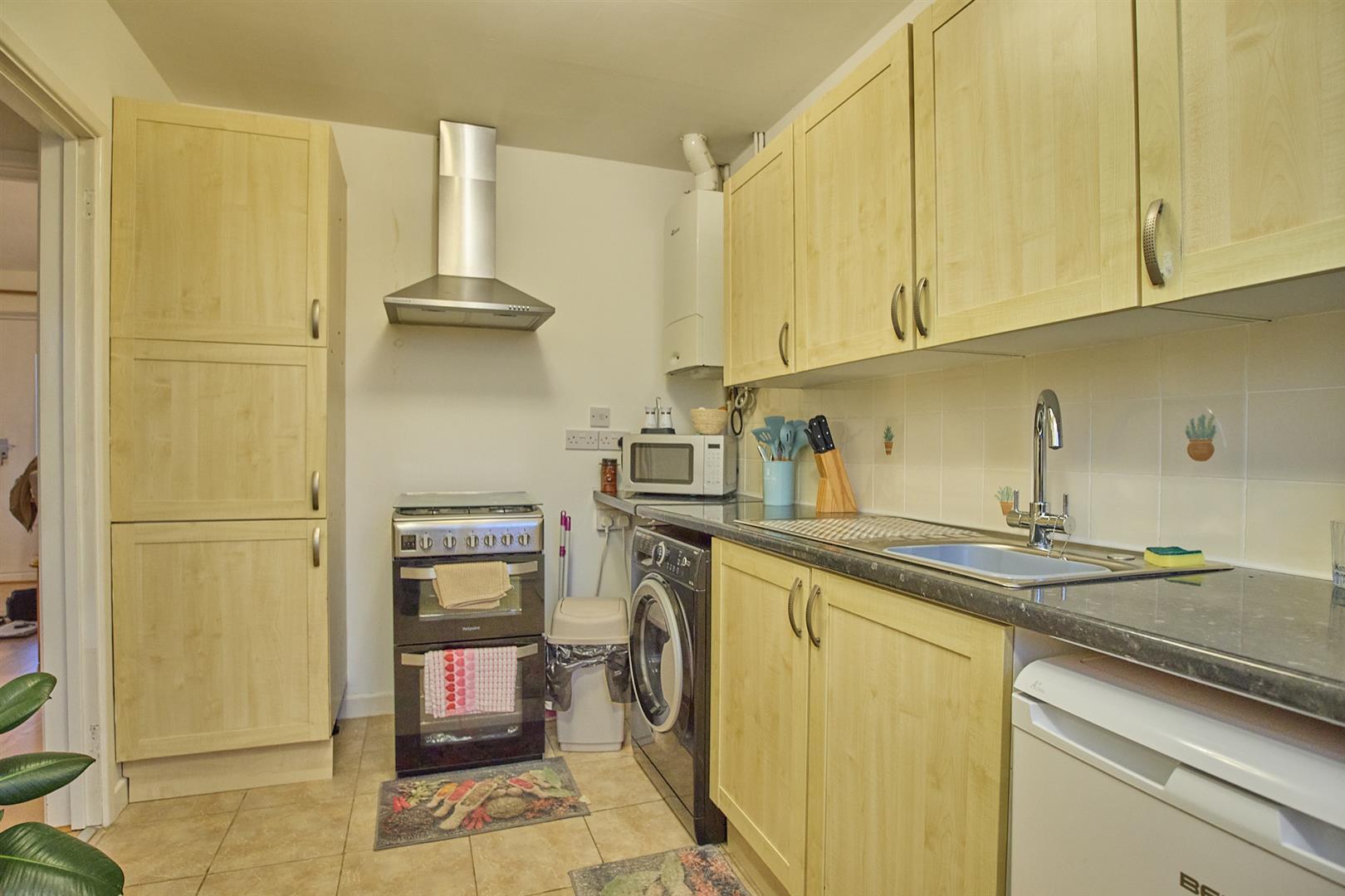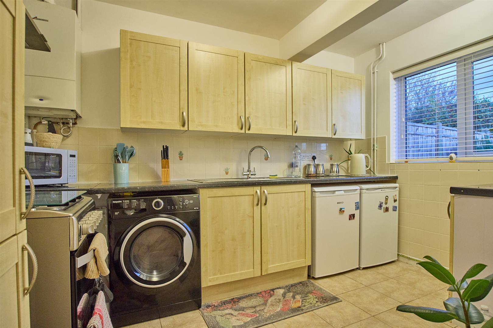With tiled flooring, a range of floor standing beechwood kitchen cupboard units with free standing oven with four ring gas hob, extractor above. Free standing washing machine, fridge and freezer, stone effect working surfaces, stainless steel sink with chrome mixer tap, tiled splashbacks. Further matching range of wall cupboard units including a larder unit, Worcester combination boiler for gas central heating and domestic hot water. Door to